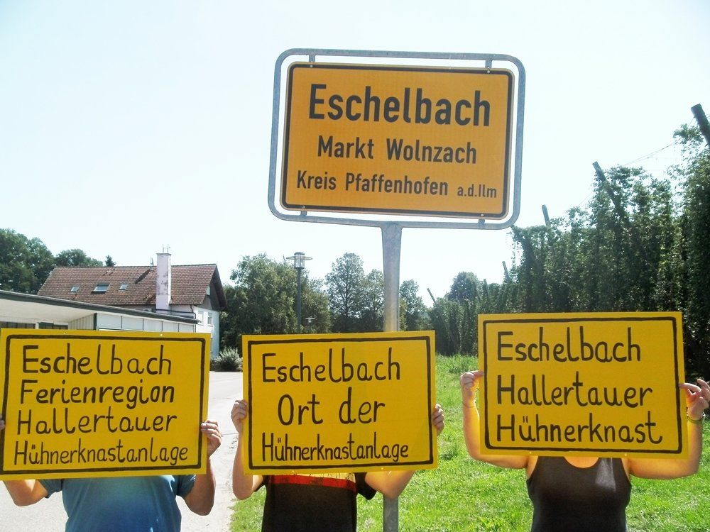 Tierschutzaktivisten haben aus Protest gegen den geplanten Bau einer riesigen Hähnchenmastanlage neue Ortsschilder für Eschelbach kreiert. Foto: Lisa Munz