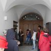 Nach einer kurzen thematischen Einführung zum Thema „Macht und Pracht“ im Hungerturm, ging es zu beispielhaften Gebäuden in Pfaffenhofen. Mit kleinen Infostreifen, die im Vorfeld verteilt wurden, konnten die Teilnehmer aktiv an der Tour teilhaben. Beim Ritterhaus Pfaffenhofen war zu berichten „Das Haus wurde 1396 erstmals schriftlich erwähnt. Wohn- und Geschäftshaus mit Neubarockfassade und steilem Satteldach mit vorgeblendetem Schweifgiebel. Über dem Portal ein Medaillon mit Relief der Muttergottes aus dem 19. Jh. Im Erdgeschoss befinden sich ein kreuzgratgewölbter Fletz und eine dreiläufige Treppe von steigenden Tonnen überwölbt. Im Obergeschoss sind Stuckdecken des 17. Jhs. erhalten. Fassade, Treppenhaus und Stuckdecken wurden 2009 restauriert.“