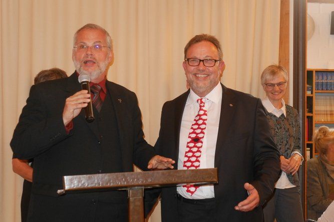 Eine rote Krawatte mit weißen Schafen, in der mittig ein schwarzes Exemplar grüßt, kleidete den Ernannten, ungemein. Entsprechend locker viel der öffentliche Empfang im voll besetzten Gemeindezentrum aus. Ein Buch mit dem Titel „Damit wir klug werden – 100 Experimente mit Gott“, überreichte der Ingolstädter Dekan Thomas Schwarz.