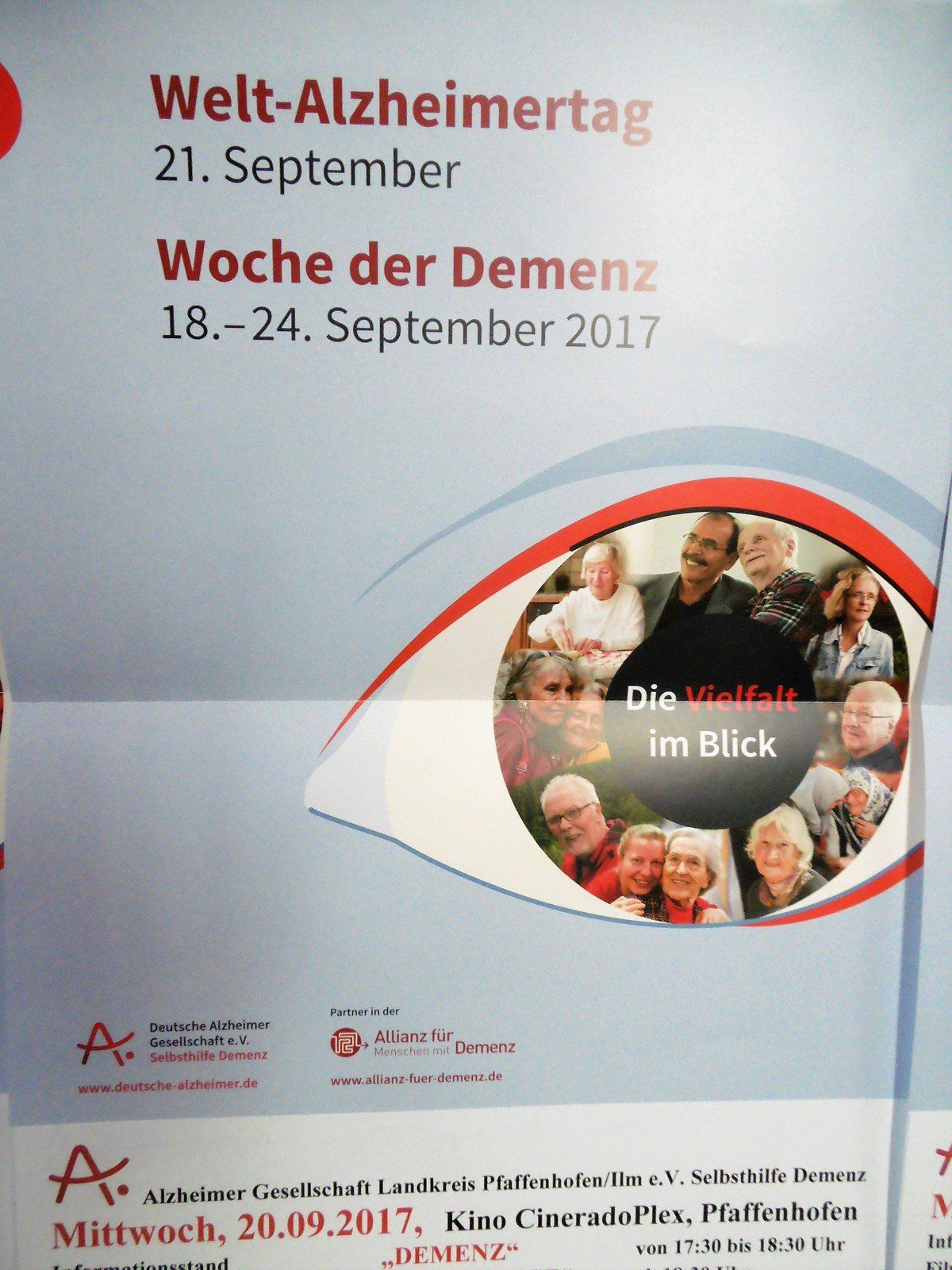 Gestern (20.9.2017) war Welt-Alzheimertag. Dieser Tag wurde 1994 ins Leben gerufen, um das Bewusstsein auf diese unheilbare Krankheit zu richten. Im Landkreis Pfaffenhofen leben zurzeit 1.500 Demenzkranke – zwei Drittel davon sind von der Alzheimerkrankheit betroffen. Die Alzheimer-Gesellschaft Pfaffenhofen hatte sich 2013 dazu entschieden, an diesem Tag in Zusammenarbeit mit dem Cineradoplex Pfaffenhofen jeweils einen Film zu dieser Thematik zu zeigen.