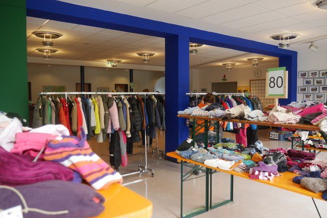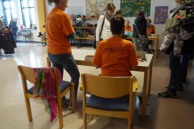 In der großen bunten Aula der Grundschule sieht es aus wie in einem Kaufhaus, nur das eben die Sachen gebraucht sind und keinem Preisdiktat folgen. Das Team, deutlich an den orangen T-Shirts zu erkennen, hilft freundlich weiter und legt auch unermüdlich die zerwühlten Kinderklamotten wieder zusammen. Mit riesigen gefüllten Plastiktüten bepackt, verlassen glückliche Mütter, denn die sind die Hauptkundschaft, den Ort der günstigen Gelegenheit.