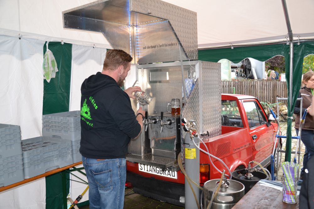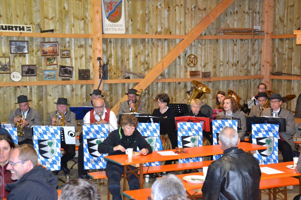 Auch wenn das Wetter in diesem Jahr, besonders am Vormittag, immer wieder kurze Schauer brachte, so hatten sich doch viele interessierte Besucher auf den Weg nach Ottersried gemacht und das aufgestellte Verpflegungszelt sowie die Biertischgarnituren in der Museumshalle sorgten dafür, dass die Besucher nicht im Regen standen. Neben Leckerem vom Grill gab es Kaffee und Kuchen sowie, wie sollte es anders sein, Bier vom Hausherrn aus seiner Kleinbrauerei "Stiang-Bräu". Und während der Mittagszeit spielte die Rohrbacher Blaskapelle in der Museumshalle auf.