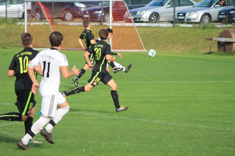 Zwar hatten die Gastgeber durch einen Freistoß aus knapp 30 Meter die erste Chance, jedoch gehörte die Partie danach den Gästen. Denn schon nach fünf Minuten gingen sie nachdem Melih Senterzi der Ball, den der Uttenhofener Torhüter zuvor parieren konnte, vor die Füße sprang und der nur noch den Ball einschieben brauchte, in Führung. Wie eingeschüchtert von dem Rückstand brachten die Gastgeber rein gar nichts zu Stande. Egal ob offensiv oder defensiv – völlige Unkonzentriertheit und Verwirrung beherrschte den BC Uttenhofen. So war es nur eine Frage der Zeit, bis die Zucheringer die Führung ausbauen konnten. In der 21. Minute verhalfen die Uttenhofener den Gästen sogar zum 2:0. Eine Ecke, die auf den kurzen Pfosten geschlagen wurde, köpfte Luciano Becker ins eigene Tor. Den weiteren Spielverlauf bestimmten auch weiterhin die Gäste, die aber nach und nach den Zug zum Tor verloren, aber trotzdem defensiv nichts anbrennen ließen.
