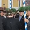 stoßen im Biertempel gemeinsam auf die erste frischgezapfte Maß an (v.l.): Festwirt Peter Schöniger, Bierkönigin Angela Ertlmaier, Bräu Wolfgang Randeltshofer, Sepp Reiser, Hopfenkönigin Melanie I. aus Elbe-Saale und Hopfen-Vize-Queen Katharina Schinagl