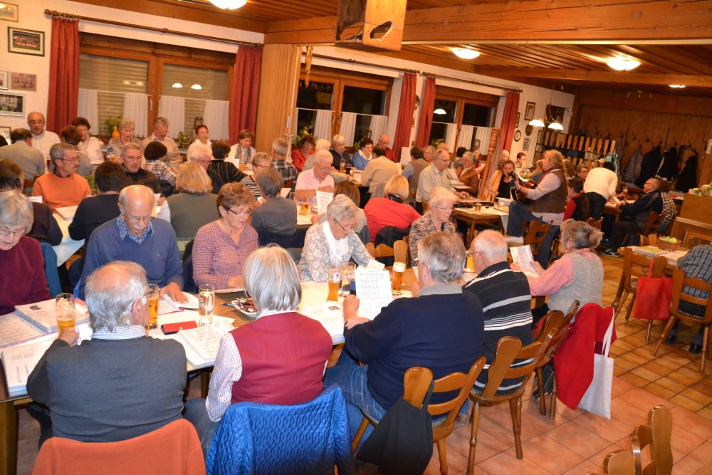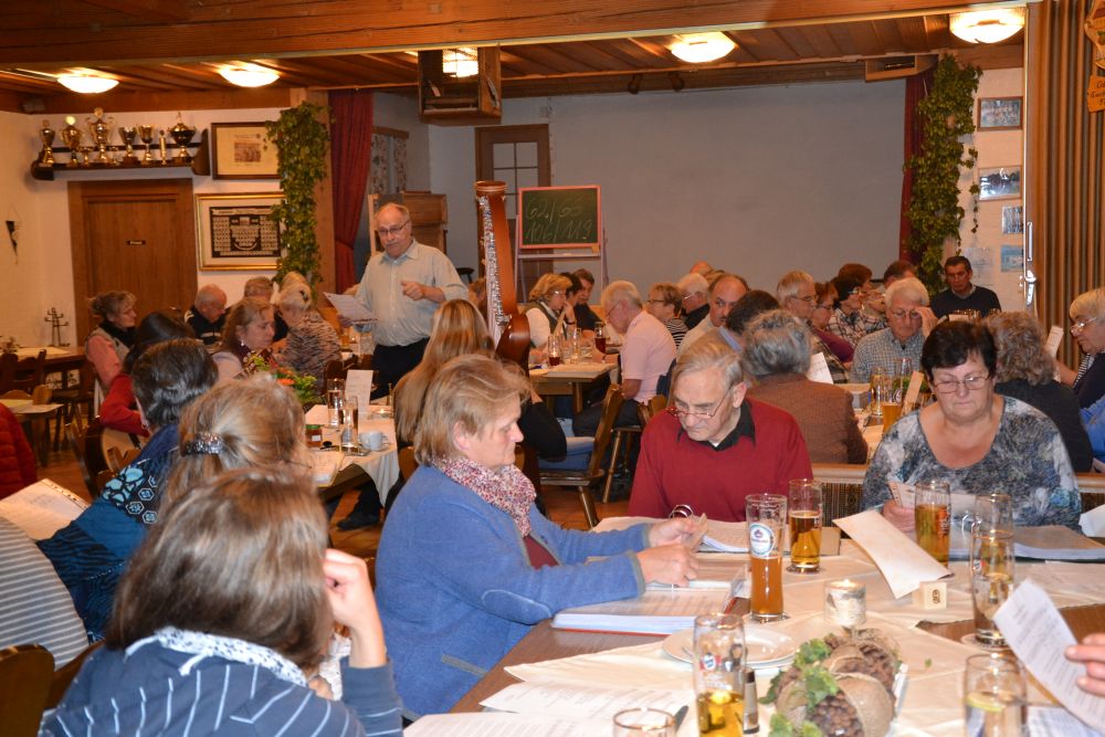 Mehr aus dem Salzburger Raum stammte das Lied „Wanns nur lei regna tuat“. Dafür musste die 1. und die 2. Stimme zunächst geprobt werden, aber Rosa Karger und Max Beer unterstützten die Sängerinnen und Sänger natürlich wieder kräftig mit ihrer „Leitstimme“, an der sich die anderen orientieren konnten – und wenn wirklich jemand im Saal glaubte, einen falschen Ton angeschlagen oder den Takt nicht rechtzeitig erreicht zu haben, so ging das ohne Probleme im großen, gemeinsamen Gesang unter, dafür musste sich niemand schämen. Und das ist eben auch das Schöne an diesem gemeinsamen Singen – jeder kann mitmachen, ohne Angst vor Fehlern zu haben. – Das Lied führte natürlich vom Regen zum Schnee, aber Hauptsache war doch, dass es nicht schlechter wird („wenn´s nur so bleibt, ist´s mir scho recht, aber schlechter kann´s nimmer wern – wenn´s mir glei guat geht, mag mi net schern, aber viel schlechter darf´s nimmer wern). Und mit diesem Lied war schon die Einleitung zur etwas besinnlicheren Zeit mit dem Lied „Und unsa lieba Frau“, die wandern gehen wollt und einen armen Schefman trifft, den sie bittet sie in sein Schef eingelassen zu werden und als sie in der Mitte des tiefen Meeres ankommen, ertönen alle Glocken die sie ins Himmelreich führen; dort angekommen mit dem Schefmann, der Armen Seele, will Petrus nur sie einlassen, doch sie erreicht, dass auch die Arme Seele ins Himmelreich darf, weil diese jede Samstagnacht ein Lichtlein angezündet hat – ein nachdenkliches Lied, das auch schon auf die kommende ruhige Zeit hinweist.