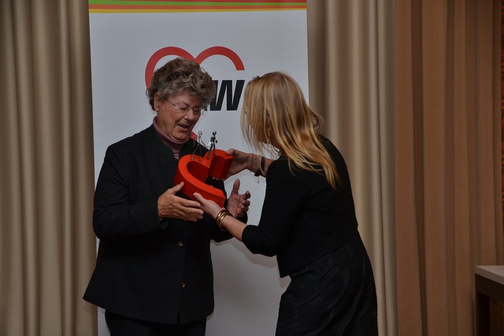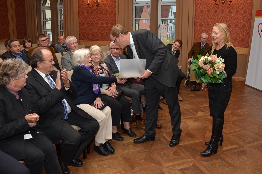 Mit dem "Roten Herz" durch den AWO Kreisverband Pfaffenhofen geehrt wurde Erika Thalmeier (l.), die unter anderem seit 39 Jahren der AWO angehört und mehr als 22 Jahre Vorsitzende des Ortsvereins Pfaffenhofen war. Ihr wurde vom Hoppe ein herausragendes Engagement bei der Vergabe der Trägerschaft für den integrativen Kindergarten Arche Noah in Pfaffenhofen-Sulzbach und ebensolches beim Wiederaufbau des Pfaffenhofener AWO Vereinsheimes nach einem Brand bescheinigt.