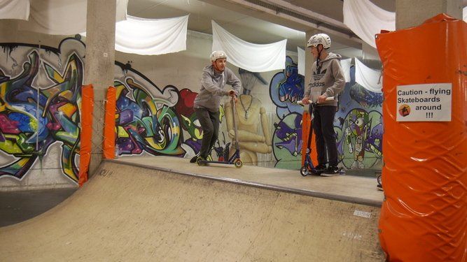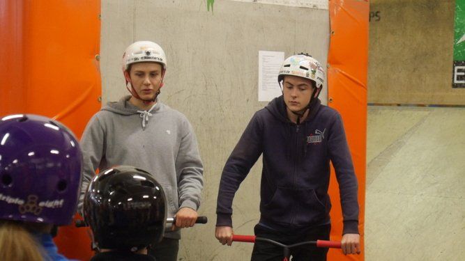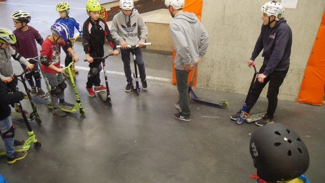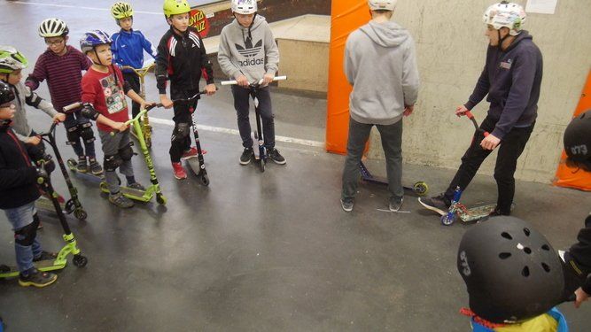 Dabei lernten die Teilnehmer ihren Scooter zu beherrschen, verschiedene Rampen in der Skatehalle zu befahren und einfache Tricks zu meistern. Am Anfang geht es um das richtige Stehen auf dem Roller oder Scooter, der Fuß sollte etwas quer zum Brett platziert sein um auch bei schwereren Tricks die Balance zu halten.