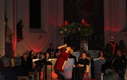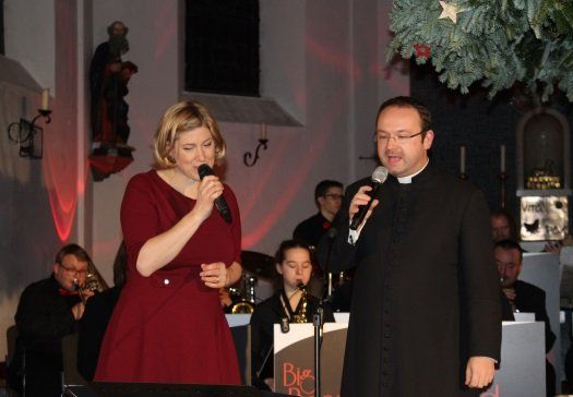 Somewhere over the Rainbow, Skys are blue, so stimmte die Big Band Nandlstadt musikalisch ein. Am Freitagabend kamen die Besucher nicht zum Beten in die Kirche St. Martin, sondern zum Konzert. „Ich darf heuer auch wieder mitmachen und es wird mit Sicherheit nicht besinnlich, aber lustig“, versicherte Pfarrer Stephan Rauscher bei seiner Begrüßung. Mit dabei war auch ein ganz besonderer Gast. Die aus Funk und Fernsehen bekannte Schauspielerin, Erzählerin und Sängerin Ines Hostel. Eine Frau mit italienischem Feuer, österreichischer Gemütlichkeit und einer herrlichen Stimme, schwärmte der Geistliche. Ihre tolle Stimme und ihr schauspielerisches Können stellte sie dann auch gleich unter Beweis mit „Walking in the Winter Wonderland“ und der wilden Geschichte von seltsamen Begegnungen im Winterwald beim Christbaum fällen mit Blutwürsten an der Nase durch Zauberhand.