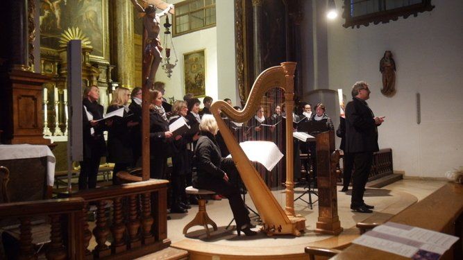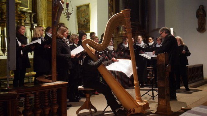 Begleitet von Beate Fürbacher an der Harfe sowie Sybille Kreitmeier an der Orgel absolvierten die Sängerinnen um Chorleiter Albin Scherer, ein beindruckendes Programm. Von Felix Mendelsohn Bartholdy über Johann Brahms, Michael Schmoll, Willy Giesen, Heinrich Poos, bis eben zu Prof. Peter Wittrich, wanderte das Programm durch zwei Jahrhunderte Musikgeschichte.