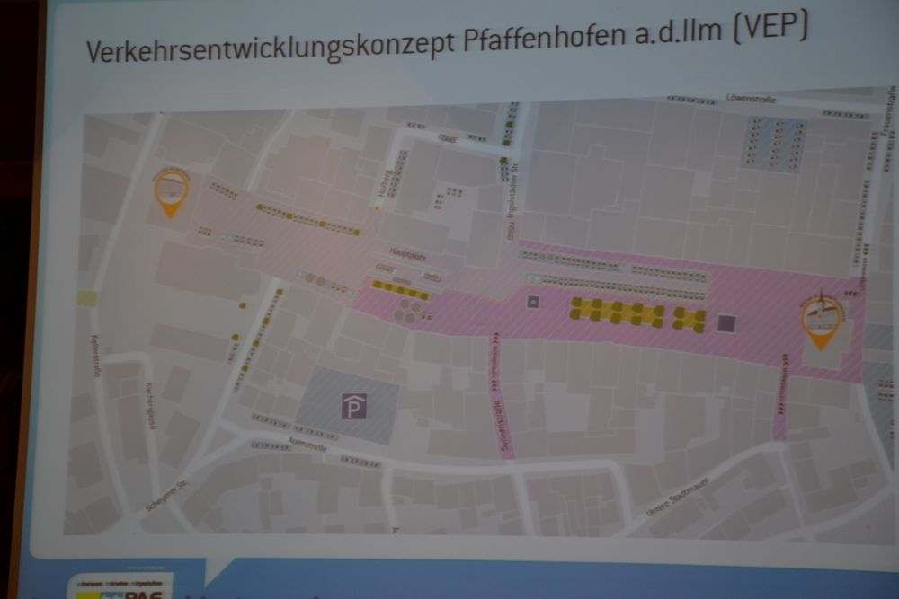 Dr. Hessel stellte anhand vieler Folien die Entwicklung des Straßenverkehrs in der Stadt bis 2030 vor, auch unter dem Aspekt, dass Pfaffenhofen um maximal 1 Prozent wachsen wolle. Bei zunehmendem Straßenverkehr sei es wichtig, den Durchgangsverkehr nach außen zu verlagern, aber nicht diejenigen davon abzuhalten, die in die Stadt wollten. Er führte mit einer Verkehrssimulation die Auswirkungen auf, die eine Verlagerung des Innenstadtverkehrs auf einzelne Straßen hätte. Und Bauamtschef Gerald Baumann ging auf die einzelnen Maßnahmen ein, die am Hauptplatz und in der weiteren Innenstadt angedacht sind. Es würden zwar Parkplätze entfallen, doch die überwiegende Anzahl würde bestehen bleiben und man könne diese auf dem Hauptplatz von beiden Seiten anfahren. Er könnte sich auch eine Verschmälerung der Fahrgasse zwischen den Parkplätzen am unteren Hauptplatz von 9 auf 6,50 Meter vorstellen, so dass ein Puffer zwischen Spielplatz und Parkreihe entstehen würde. Die Fußgängerzone könnte dann weiter durch Sitzmöglichkeiten und Bäume aufgewertet werden, wenn der Durchgangsverkehr draußen bleiben würde. Er stellte dabei zur Demonstration vorher-/nachher Fotos vor.