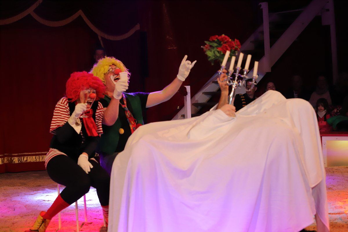 Was wäre ein Zirkus ohne bunte Kostüme, laute Lacher, stille Clowns und rätselhaften Darbietungen? Schon die allerkleinsten Tonellis wussten als Mini-Olafs, Elsas und Annas die Herzen ihrer Zuschauer zu erobern. Früh übt sich, denn irgendwann gehört man vielleicht auch zu den „Ka Hana Mana Blues“, die mit von oben bis unten in blau auf Trommeln und Röhren eine Hommage an die weltbekannte Blue Man Group richtete. Immer wieder wimmelte es auf der Manege von Clowns, die mal romantisch, mal ganz still und mal mit kräftigen Seitenhieben gegen die Wolnzacher Obrigkeit das Zirkuszelt beben ließen. Wussten Sie zum Beispiel schon von all den Obergrenzen, denen sich ein Wolnzacher Tag für Tag ausgesetzt fühlt? Wochenmarkt, Giggerlfabrik und Volksfest – egal ob kulinarisch, akustisch oder olfaktorisch, das „Philosophische Quartett“ hatte eine ganz einfache Lösung für all diese Probleme. Der Wochenmarkt kommt ins Rathaus, die Giggerlfabrik in die Kläranlage und das Volksfest nach Eschelbach! „De zwoa Hena vo da Hopfenköniginnenwahl stört dort koana!“, so das bitterböse Resümee des Clown Trios.