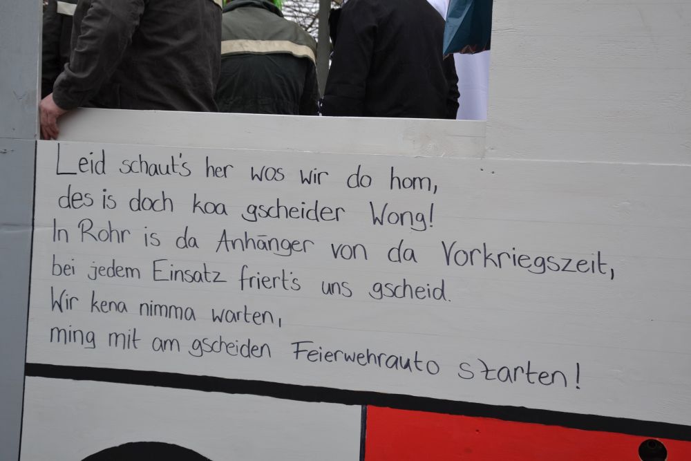 Und am Sonntag kam dann die 3. Auflage. Großes Gedränge herrschte deshalb vorwiegend an den Straßen in Rohr und Rinnberg, durch die sich der Faschingszug mit 11 Motivwagen und vielen begleitenden Kleingruppen schlängelte. Vorneweg natürlich der Wagen der Rohrer Feuerwehr, auch die Gambacher Wehr hatte einen Wagen beigesteuert und beide Ortsteilwehren beklagen sich über die fehlende Ausstattung mit Feuerwehrfahrzeugen. So unkte die Rohrer Wehr, dass die Fahrzeugweihe voraussichtlich im Jahr 2040 stattfinden werde.
