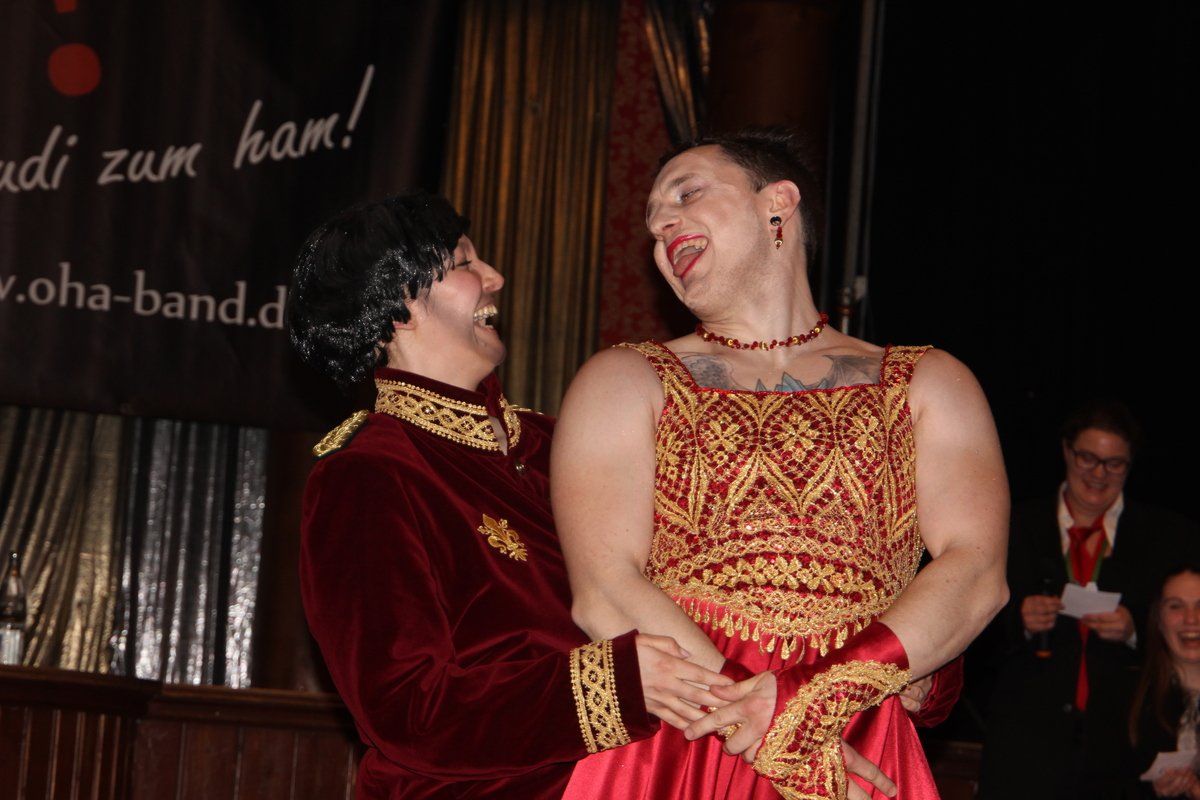 Bald schon kam der eigentliche Höhepunkt des Abends, der „Ball verkehrt“. Das lustige Spektakel, bei dem die Rollen getauscht werden, ist immer wieder äußerst sehenswert. Ein Anblick für Götter waren neben dem Prinzenpaar auch die burschikosen Gardemädels, die für die gekonnte Nachahmung der holden Weiblichkeit in zu kurz geratenen Kleidern sehr zur allgemeinen Erheiterung beitrugen.
