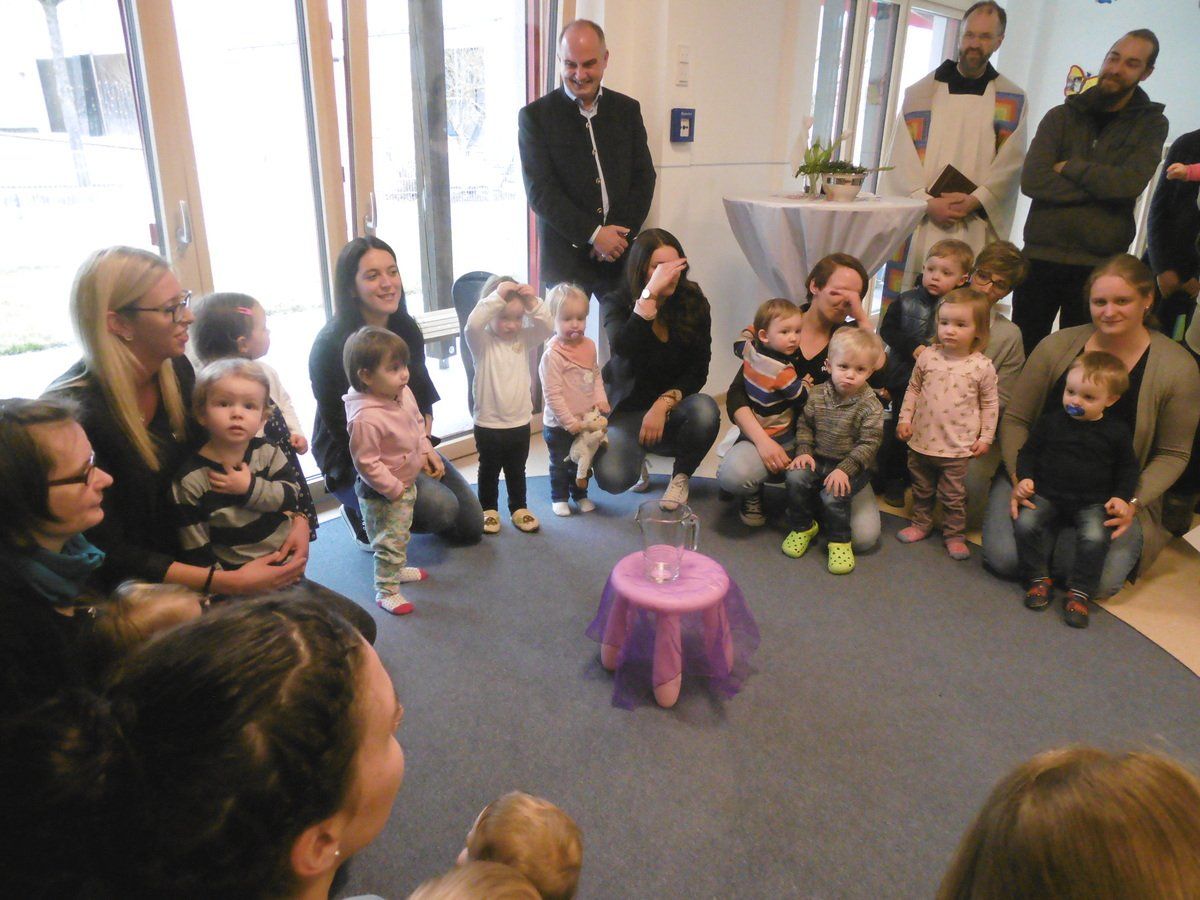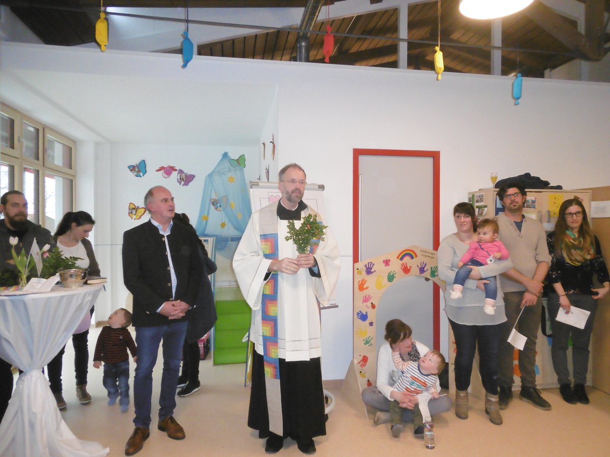 gleichermaßen wie Eltern, Großeltern und den den Bau ausführenden Firmen gebetet wurde. „Mögen sich die Kinder hier in dieser Indoor-Waldkinderkrippe wohlfühlen. Kinder haben ein angeborenes Grundvertrauen und die Kinder vertrauen Ihnen. Leider geht dieses Grundvertrauen uns Erwachsenen ja viel zu schnell verloren.“ Danach segnete er die Räumlichkeiten mit Weihwasser und einem extra vom Mesmer gebundenen Palmbüschel.