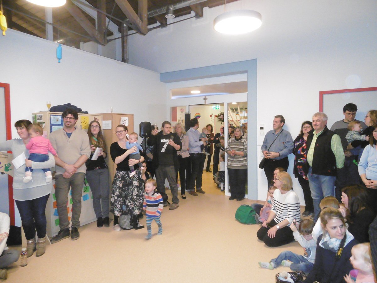 Dann kamen die Kinder mit den Erzieherinnen herein. Obwohl die meisten der Kleinen noch gar nicht richtig wussten, wie ihnen geschah - vor so vielen Leuten - gab es dann doch das ein oder andere Kleinkind, welches mutig in die Mitte des Kreises krabbelte oder sich traute, an der Hand einer Kindererzieherin vorsichtig mit dem Bein zu wippen. Herzig anzuschauen waren die Kleinen allemal.
