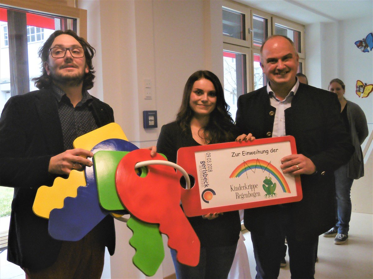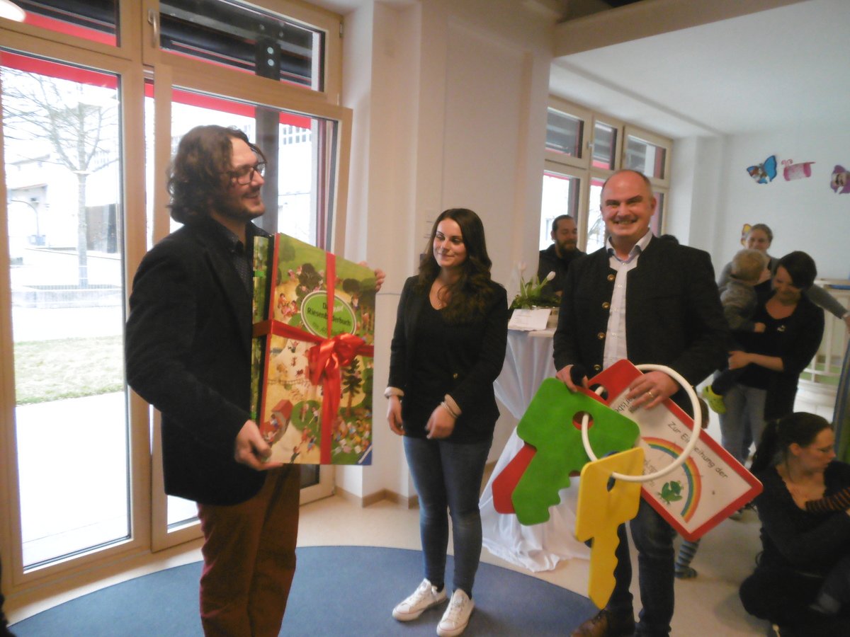 Architekt Sebastian Gerlsbeck übergab an Krippenleitung Eva Bernert den obligatorischen Schlüssel. Rechts daneben: Hausherr Bürgermeister Manfred Sterz