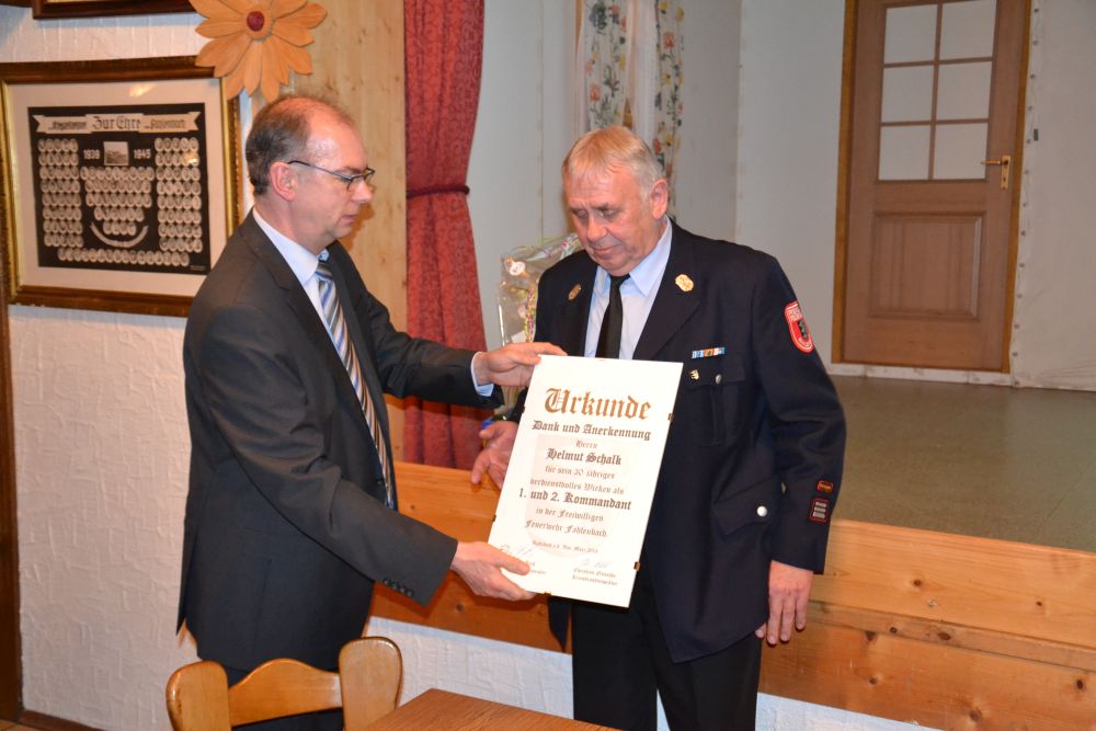 Nach 24 Jahren als 1. Kommandant (und davor 6 Jahren als 2. Kommandant) hielt Helmut Schalk seinen letzten Tätigkeitsbericht. Er ging ein auf die Einsätze im letzten Jahr, dabei seien die Brandeinsätze mit 14 fast doppelt so hoch wie 2016 mit 8, auch die Fehlalarmierungen durch Brandmeldeanlagen hätten zugenommen, die Technischen Hilfeleistungen dagegen abgenommen. Bei den Einsätzen waren 320 Wehrmänner aktiv, die 800 Stunden bei Einsätzen, Übungen und Lehrgängen geleistet hatten. Die größten Brände waren die bei der Zimmerei Alt und bei der Scheune an der Fahlenbacher Straße. In einem persönlichen Rückblick ging Helmut Schalk auf seine langen Jahre als Kommandant ein und bedankte sich bei allen Aktiven und Ehemaligen für die gute Zusammenarbeit. Dann ging er auf die vielen wichtigen Punkte seiner langen Dienstzeit ein und konnte dabei für jedes Jahr bis zu drei Highlights anführen. Bürgermeister Peter Keck dankte Helmut Schalk für seine langjährige Tätigkeit und überreichte ihm eine Dankes-Urkunde der Gemeinde sowie für dessen Gattin einen Blumenstock, da sie ihm immer den Rücken frei gehalten hatte.