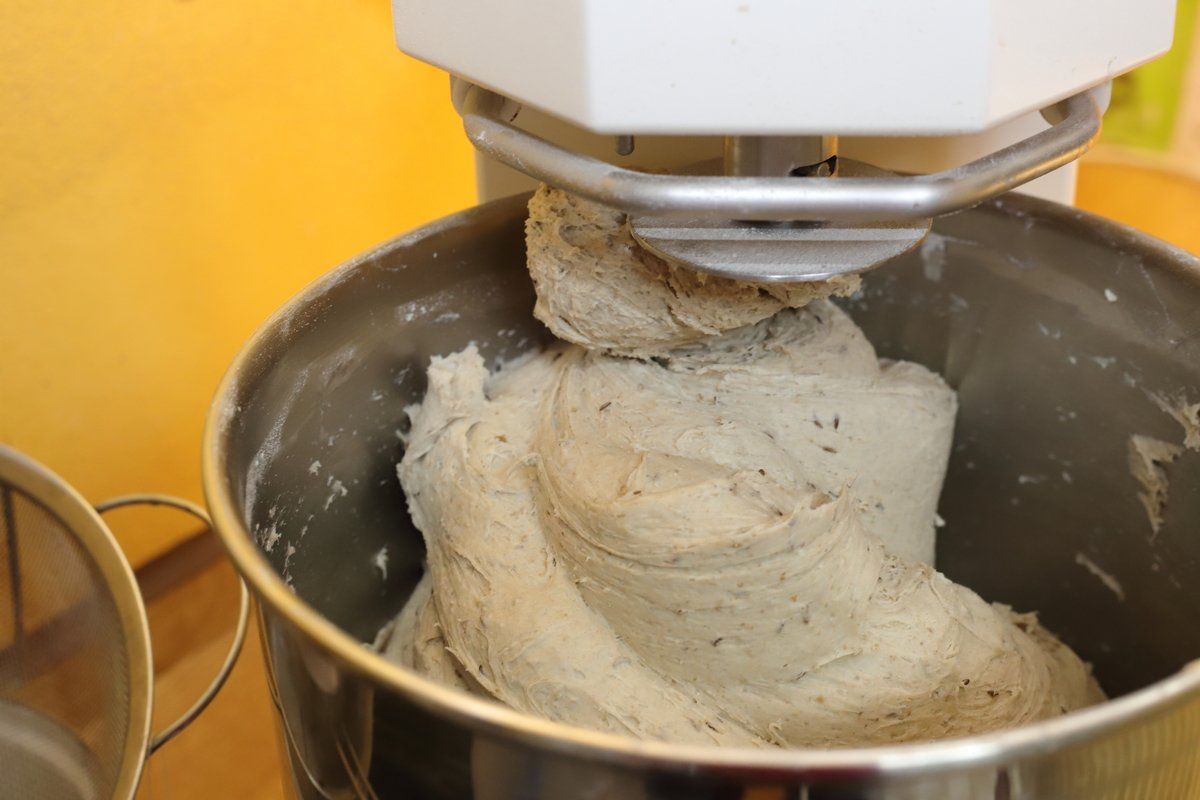 „Man muss den Teig schmatzen hören“, so Schachtner, als sie die Zutaten mit dem Knethaken zu einem Teig verarbeitet. Gerne betonen Bäcker, dass backen auch eine Rechenkunst ist. Für Gertraud Schachtner spielt aber vor allem die Erfahrung eine wichtige Rolle. „Backen für den Hausgebrauch hat nicht immer die gleichen Voraussetzungen wie eine professionelle Backstube in der Bäckerei. Die Luftfeuchtigkeit schwankt, das kann die Flüssigkeitsmenge beeinflussen.“ So braucht es am Ende das richtige Gespür, wann der Teig passt. Für sie ist das, wenn er sich vom Rand der Rührschüssel löst und leise schmatzt. „Jetzt ist er perfekt!“