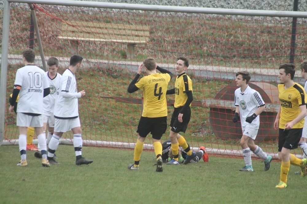 Auf mehr als dürftigem Geläuf trafen die zwei U19 Mannschaften insgesamt zum dritten Mal in dieser Saison aufeinander. Ein Vorbereitungsspiel vor der Saison konnten die Uttenhofener souverän mit 8:1 für sich entscheiden, die Hinrundenpartie endete mit einem 2:2 Unentschieden. Pünktlich um 12 Uhr pfiff Schiedsrichter Werner Thorwarth die Partie, die von Anfang an Spannung versprach, an. Die Gastgeber setzten den ST Scheyern vor allem in der Anfangsphase der Partie ziemlich unter Druck und zwangen sie zur Defensivarbeit. Schon nach zehn Minuten gelang aus spitzem Winkel der zweite Abschluss der Uttenhofener durch Martin Lichtenstern, der direkt ins Tor zum 1:0 Führungstreffer traf.