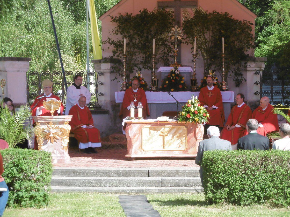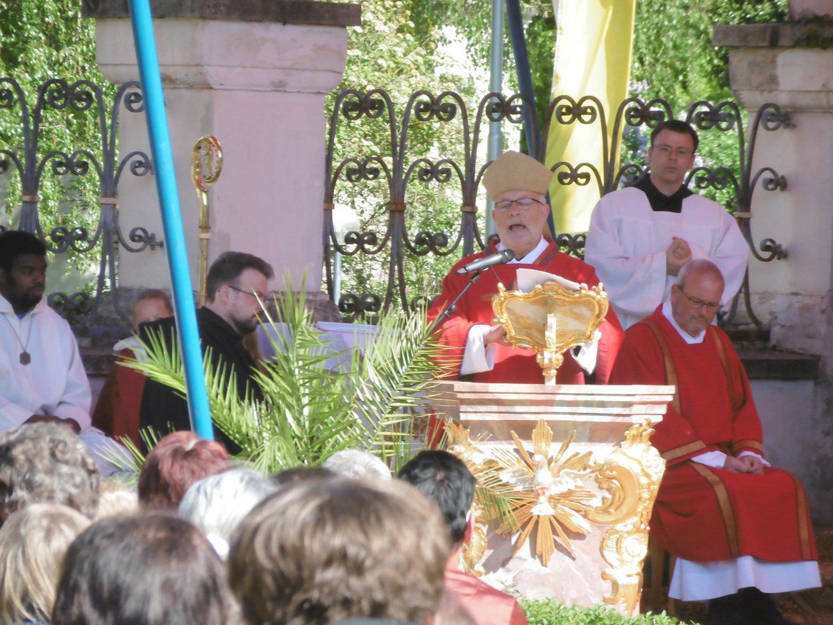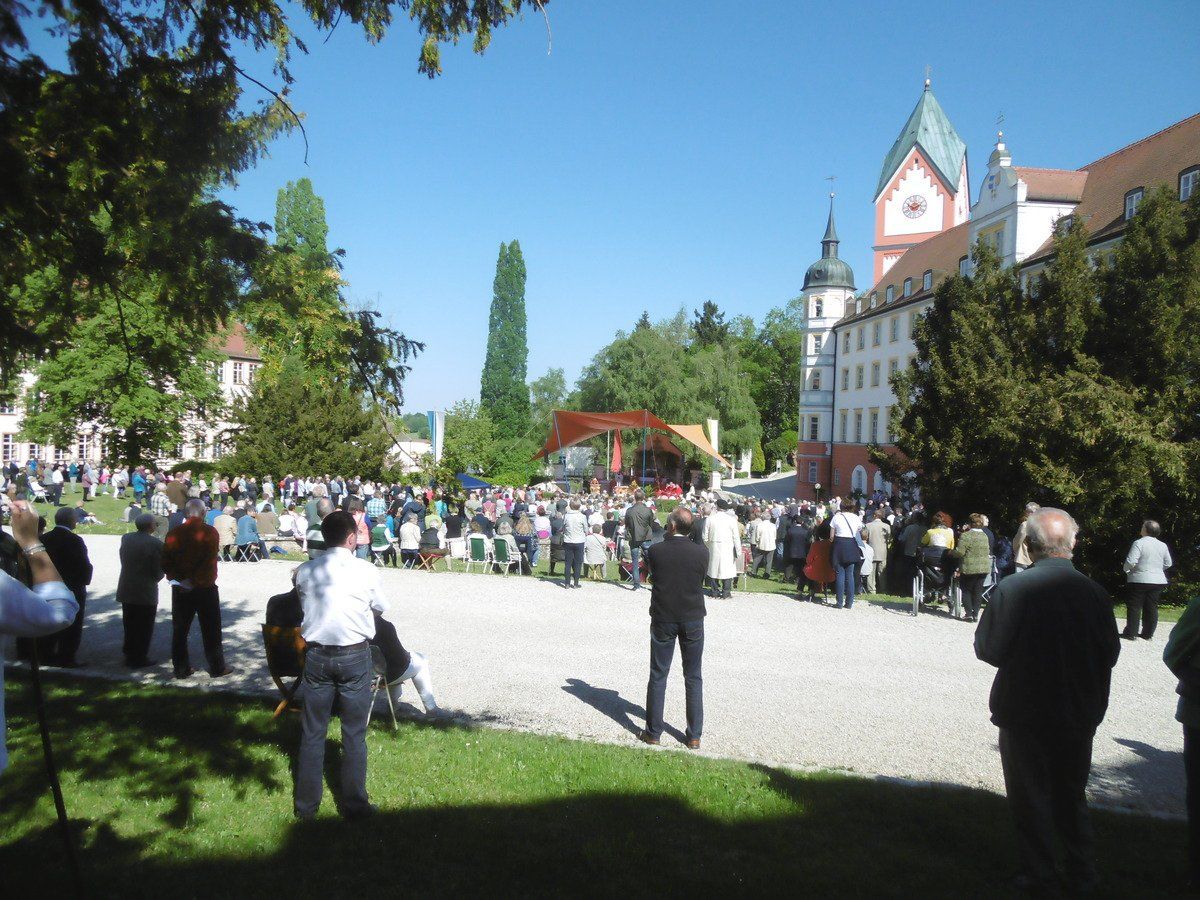 Der Himmel azurblau; die frisch gemähten Gärten der Klosterinnenlage im saftigen grün; die Sonne strahlte wärmend herab und die meisten Besucher des Kreuzfestes, die keinen Platz auf den aufgestellten Stuhlreihen bekommen hatten, machten es sich einfach auf dem Rasen bequem und lauschten den Worten des Erzabtes Wolfgang Öxler. Ruhig und friedlich war die Stimmung; nur ab und zu sangen auch die Vöglein zu der herzerfrischenden und sehr menschlichen Predigt des Gottesmannes, die aus zahlreichen Lautsprechern tönte.