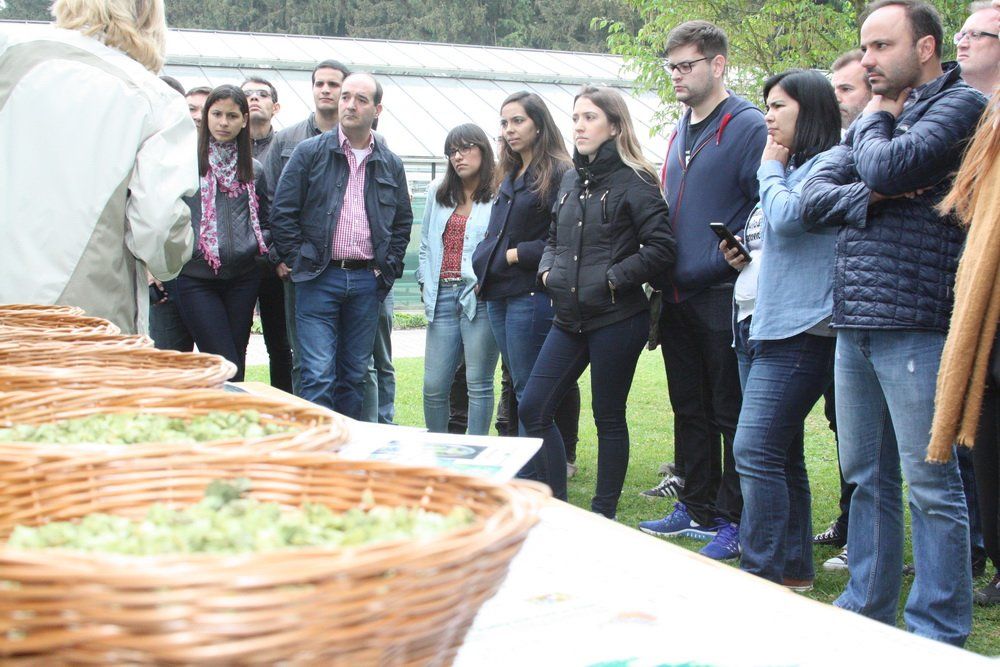 „Bier ist so ein interessantes Lebensmittel“, erzählt Daniella. Die 29-jährige ist Lebensmittel-Ingenieurin, ihre Kollegin Barbara (29) Chemie-Ingeneurin. Die beiden Brasilianerinnen arbeiten schon seit einigen Jahren bei Konzernschwester InBev. „Wir benutzen fast ausschließlich Hopfen aus der Hallertau“, meint Daniella. Umso wichtiger ist es für sie als zukünftige Brauerin genau zu verstehen, was ihn erst zum „grünen Gold“ werden lässt. „Die vielen Variationen an Geschmack und Aroma zu verstehen, ist der Schlüssel zu gutem Bier“, erklärt auch Ausbilderin Jennifer Eckstein. Station im renommierten Hopfenforschungszentrum in Hüll und dem dort ebenfalls ansässigem Anheuser-Busch Versuchs-Hopfengut zu machen, ist da schon fast obligatorisch.