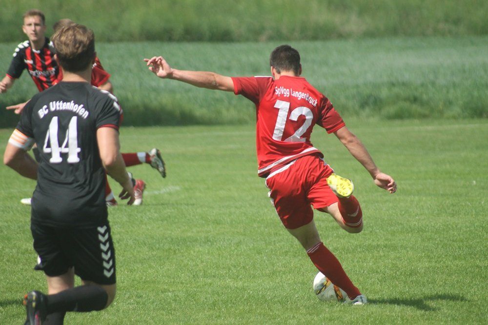Die Partie am Muttertag war für die Uttenhofener die erste von vier Übrigen – dass die Gäste aus Langebruck kein einfacher Gegner waren, bewiesen sie zuletzt. Als Tabellenfünfter konnte man den FC Geisenfeld besiegen und auch auswärts beim FC Tegernbach einen Punkt mitnehmen. So musste man sich auch im Spiel gegen den BC Uttenhofen am vergangenen Sonntag auf keinen Fall verstecken! Im Gegenteil – von Anfang an hielt die SpVgg Langenbruck gegen den BCU gut dagegen und hatte größten teils sogar mehr Spielanteile. Die ersten guten Torabschlüsse hatten jedoch die Gastgeber. Doch sowohl ein Schuss aus knapp 18 Metern in der zehnten Minute, als auch einen Freistoß von Andreas Kastner in der 20. Minute konnte der Gästetorhüter parieren, bzw. ins Toraus klären. Aber aus dem anschließenden Eckball entstand prompt die 1:0 Führung für den BC Uttenhofen. Kastner, der zuvor am Keeper scheiterte, brachte den Ball in die Mitte – da niemand wirklich an den Ball ging, kam dieser an den zweiten Pfosten, wo Uttenhofens Kapitän Lavdim Spaija perfekt stand und den Ball ins Tor köpfte.