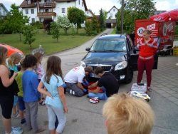Vor allem bei den Kindern kamen die vorgeführten Szenarien, bei welchen sie hautnah erleben durften wie eigentlich ein Verletzter nach einem Unfall versorgt wird, sehr gut an. Im Anschluss durfte man sich auch mal einen Rettungswagen von innen ansehen. Außerdem konnten sich die Kinder in der Hüpfburg austoben, oder in der Bastelecke kreativ werden.
