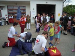 Um die gut besuchte Mittagszeit demonstrierte das Rote Kreuz den Umgang mit Verletzten bei drei verschiedenen Übungen, wie das Versorgen einer angefahrenen Person, das Bergen aus einem Auto und die Versorgung einer bewusstlosen Person.