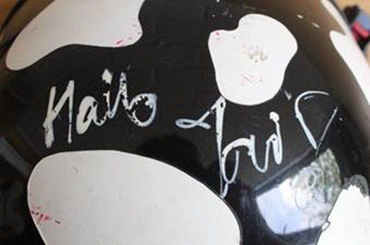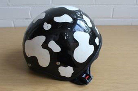 Am Tatort konnten diverse Gegenstände aufgefunden werden, die nach Ansicht der Polizei den Tätern zuzuordnen sind. Darunter ein Motorroller-Helm mit auffälligem „Flecken-Muster“ und einer handgeschriebenen Aufschrift (siehe Fotos).