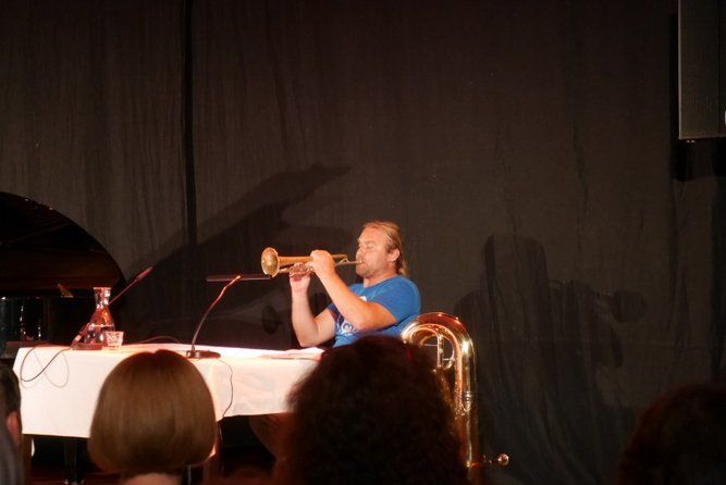 Da wird, der als Ersatz für seinen Bruder eingesprungene Pianist Tim Allhoff, immerhin Echo Preis Träger wie Hofmeir, erst beiläufig erwähnt, dann aber zum Runnig Gag, was die Übernachtungsfrage betrifft. Die beiden Herren sprechen miteinander die Sprache der Musik, eingepackt in Hofmeir‘s biografische Aufzeichnungen, die er, wie er ebenfalls beiläufig erwähnt, der Einfachheit halber aus seinem Buch "schrecklich wahre Geschichten aus meinem Leben mit der Tuba", abließt. Kein Aufwand, alles pur wie es sich für einen waschechten Oberbayern gehört.