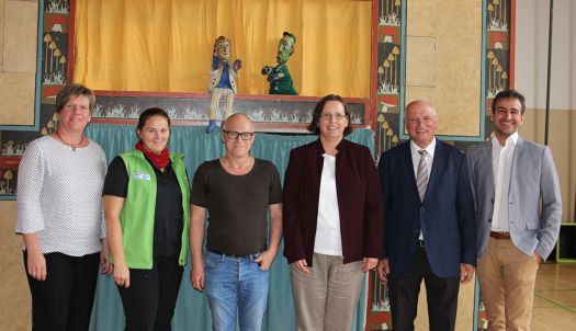 v.l. Heike Huber (Integrationsstelle Kelheim), Gebietsbetreuerin der "Weltenburger Enge" Franziska Jäger, "Kasperlsprecher" Josef Parzefall, Christine Bader (Bayerischer Naturschutzfonds) Josef Reiser und Schulleiter Tobias Barwanietz
