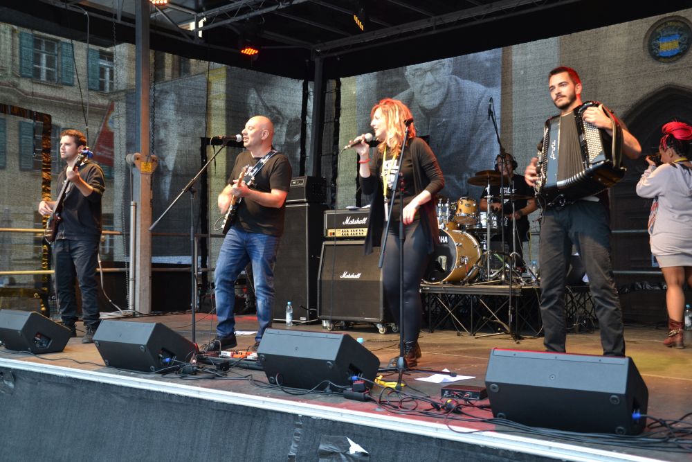 Die serbische Band „KAL“ war extra für dieses Konzert aus Belgrad (Serbien) angereist und lieferte eine hervorragende Performance. Sie verstehen sich als urbane Roma-Band und mischten ihren Musikstil mit osteuropäischem Rocksound und den verschiedensten internationalen Einflüssen. Wer ihre Musik auch zu Hause hören wollte, konnte sich eine ihrer zwei herausgekommenen CDs kaufen. Und wie zu hören war, haben sie bereits auf sehr vielen internationalen Festivals gespielt und das Publikum begeistert, wie auch das Pfaffenhofener, denn im Laufe des Abends ging die Musik auch in die Beine und einige Begeisterte tanzten auf dem Platz.