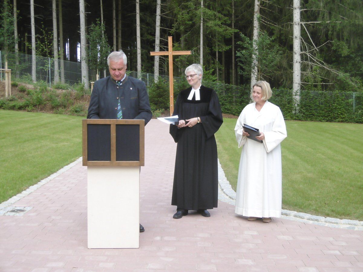 Die Atmosphäre bei der feierlichen Einweihungszeremonie des modernisierten bzw. erweiterten Waldfriedhofes am Samstag Nachmittag war schon eine ganz besondere. Durch das Rauschen der Bäume und das Vogelgezwitscher herrschte eine außerordentliche, eine friedliche Stimmung. Gesegnet wurde diese Stätte gleich durch zwei Geistlichkeiten. Nämlich von der katholischen Gemeindereferentin Christiane März und der evangelischen Pfarrerin Doris Alt. Musikalisch umrahmte der Kirchenchor unter der Leitung von Elisabeth Stocker mit passenden Liedern die offizielle Freigabe des erweiterten Waldfriedhofes.