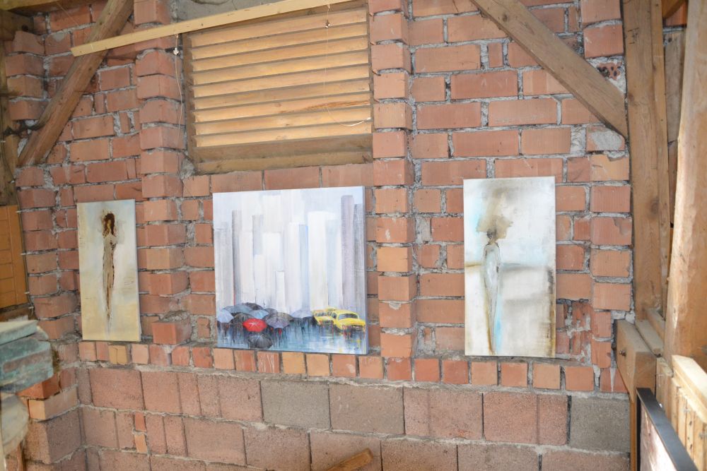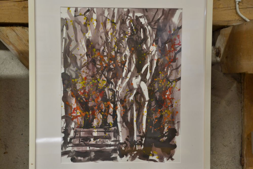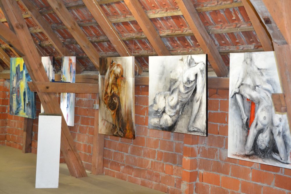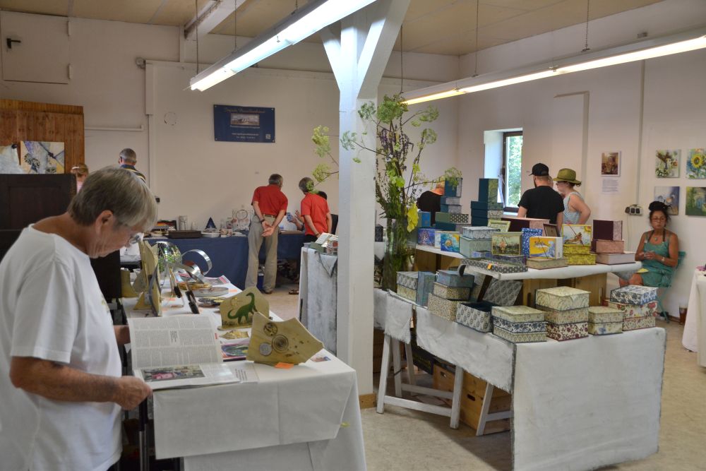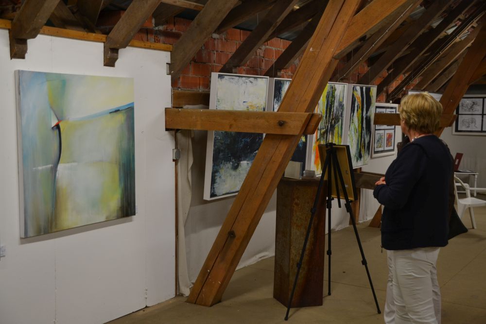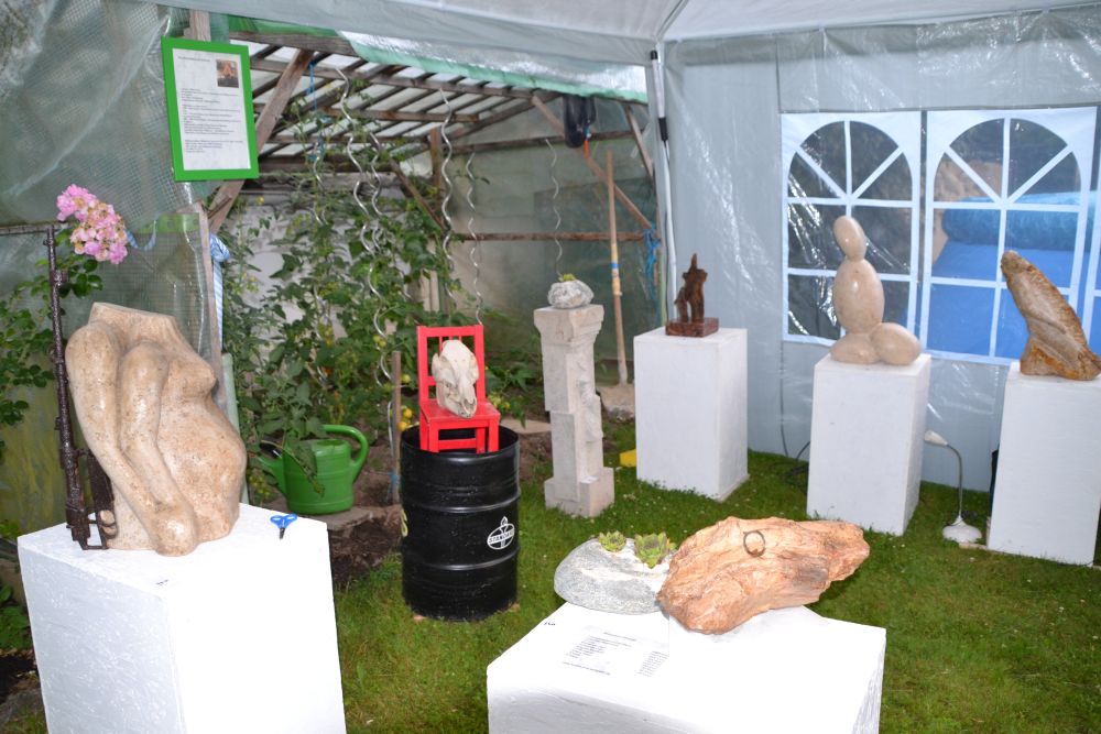 Die Gäste konnten in der Ausstellung alle möglichen Stilrichtungen von klassisch, abstrakt und konkret sowie Maltechniken (Öl, Acryl, Misch- und Drucktechniken sowie Aquarell) betrachten. Außerdem wurde selbst hergestellter Schmuck präsentiert, Stelen aus Metall/Glas, Mosaikarbeiten, Steinskulpturen und Keramikarbeiten. Einigen Künstlerinnen konnten die Besucher bei ihrer Arbeit zuschauen, so den Mosaikkünstlerinnen Caroline Jung und Sylvia Kaczynski oder Marlies Klostermann bei der Herstellung von Glasperlenschmuck. Franz Jansens zeigte nicht nur seine Bilder und Drucke im Obergeschoss der Scheune, er hatte im Schuppen des Gartens auch seine Baum-Drucke auf Japan-Papier ausgehängt, die sich im leichten Wind hin und her bewegten und so das Gefühl eines Waldes vermittelten. Auch interessant die großen Steinskulpturen des Hausherrn Helmut Hofer, die immer wieder Erstaunen hervorriefen. Mit osteuropäischer Folkloremalerei und wunderbar farblich gestalteten Eiern war Lyudmyla Storozhenko vertreten und Jana A. Hermann mit künstlerisch gestalteten Keramikkreuzen und Bildern mit eigener entwickelter Maltechnik (Aspiti).