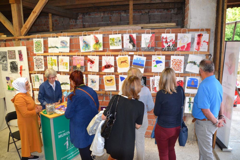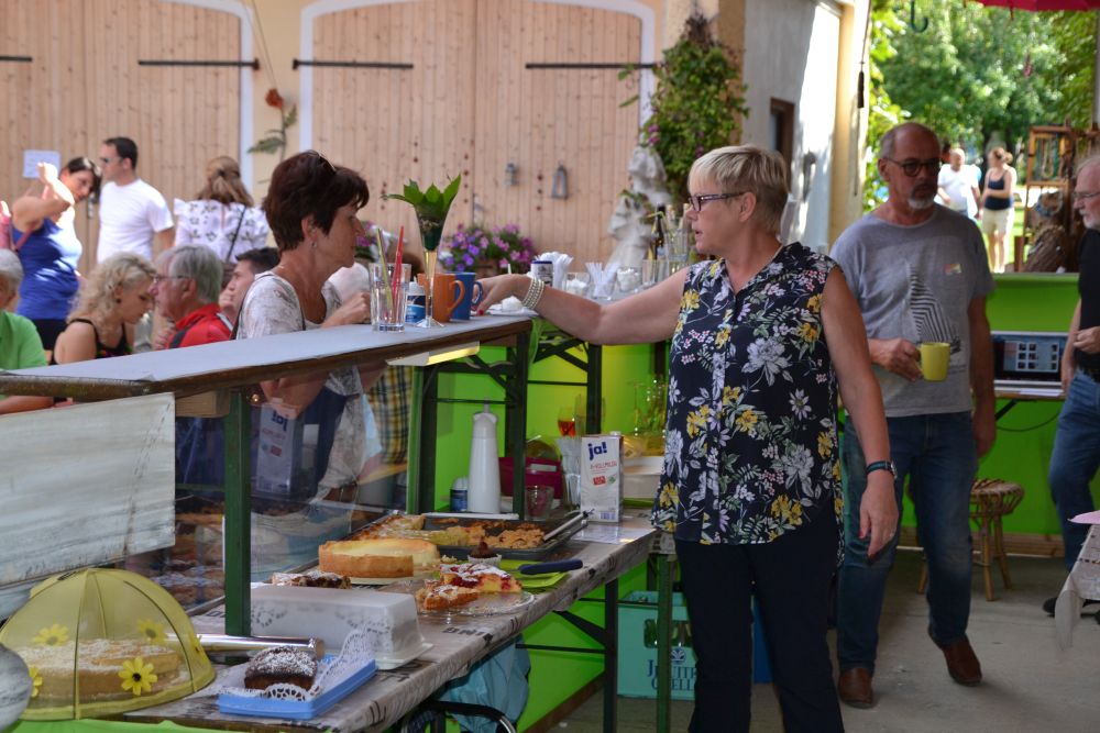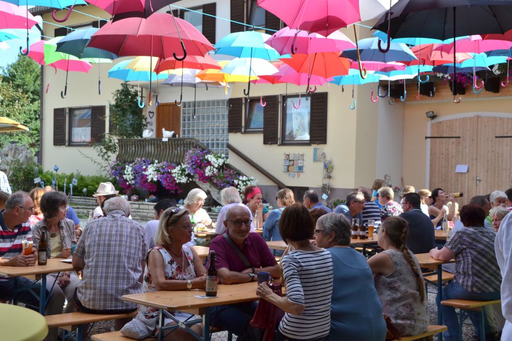 Die Begeisterung der Besucher galt auch der Vielfalt und Vielzahl der AusstellerInnen und ihrer Werke sowie dem tollen Ambiente des Hofes und Gartens. Viele Besucher waren zum ersten Mal zu Besuch und konnten sich gar nicht sattsehen, so sehr waren sie beeindruckt. Durch die Gestaltung des Außenbereichs wurden auch viele Spontangäste angelockt, die im Vorbeifahren die tanzenden bunten Regenschirme über dem Innenhof registrierten, das riesige Banner mit gut 30 Einzelbildern auf Stoff an der Hopfendarre und die vielen parkenden Autos an der Straße – das machte sie natürlich neugierig. Da es ausgezeichnetes Essen und Trinken gab, lohnte sich schon allein oft dieser Zwischenstopp, wie ein Biker feststellte, doch noch mehr war er dann überrascht, was er alles Wunderbares im Garten und in den Räumen sah. Viele der neuen Gäste nahmen sich sogar vor, im nächsten Jahr wieder vorbeizuschauen.