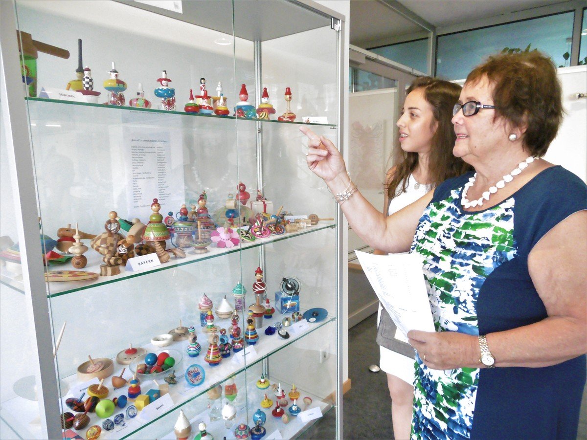 Frau Dr. Franziska Krammer-Keck war die langjährige Nachrichtensprecherin des Bayrischen Rundfunkes, vielen Pfaffenhofenern auch bekannt durch ihre Italienisch-Kurse, von ihren Lesungen und dem Turmschreiber-Verlag. Seit 1995 sammelte sie über 300 Kreisel aus vier Kontinenten. „Viele Kreisel sind schwer zu finden, weil es nicht mehr in ist, sich selbst zu bewegen,“ so Krammer-Keck. Sie hatte zur Vernissage die 16jährige Maja Dobrivojevic mitgenommen. Dem Mädchen hatte sie als Austauschschülerin ihr Heim zur Verfügung gestellt, nachdem jüngst Bernd Duschner vom Verein „Freundschaft mit Valjevo“ hierfür einen Aufruf gestartet hatte.