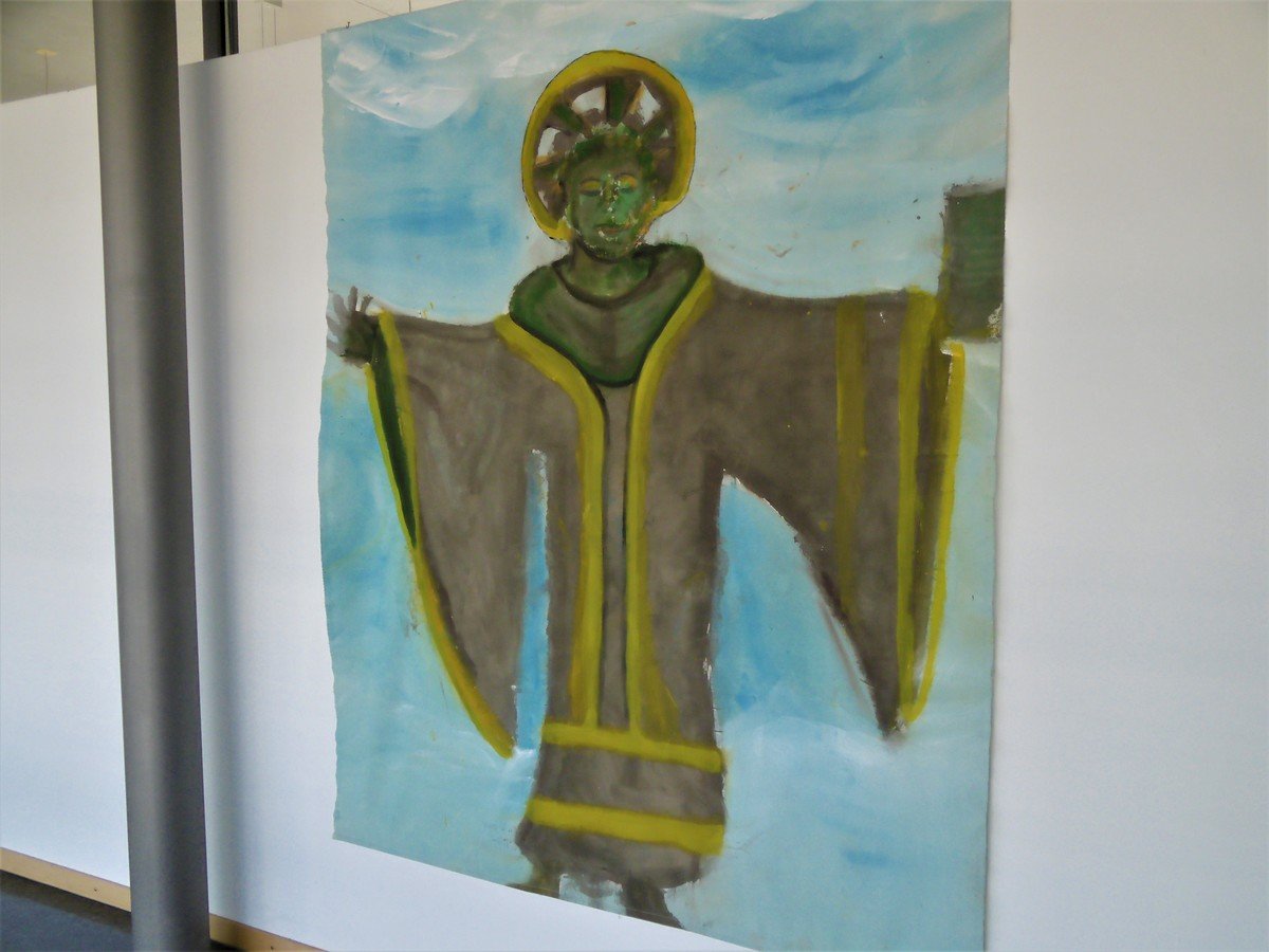 Serio Digitalino präsentierte Kunstprojekte in Zusammenarbeit mit Schulen, wie z.B. der Joseph-Maria-Lutz-Schule, der Grund- und Mittelschule Geisenfeld und der Münchner Hasenbergl-Schulen. Die großformatigen Acrylwerke begeisterten gestern Abend die Gäste. Gerade das Bildnis zum Thema „Mein Zuhause“ zeigt deutlich, dass, so Feßl: „die Kinder es kapiert haben. Es es unsere bunte Wirklichkeit und da sind nicht alle hellhäutig.“