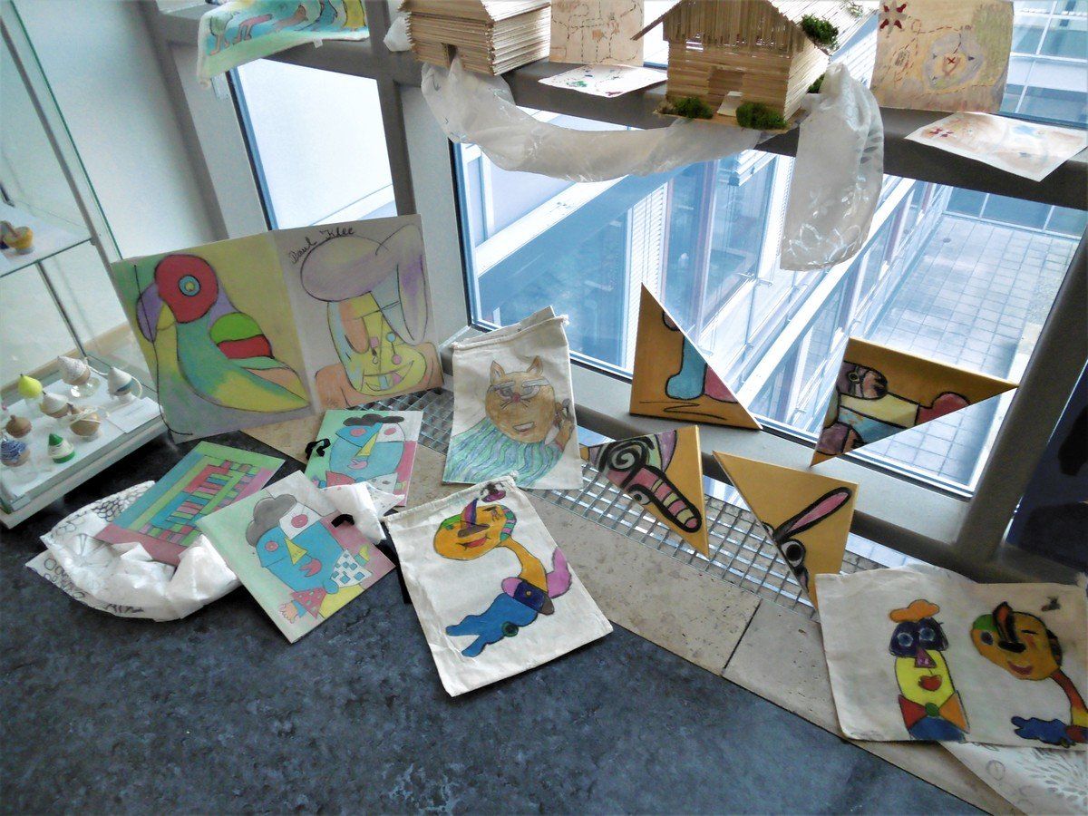 Mit den Worten: „Liebe Freunde des Finanzamtes“ begann Peter Feßl seine Laudatio und erntete damit natürlich Lacher. „Kinder malen aus dem Herzen und nicht um fünf Ecken herum“, so Feßl. Die gebastelten Müllmonster, die im Servicezentrum zu bestaunen sind, stehen im Gegensatz zu den Recycling-Produkten wie den Buchkunstwerken und den bedruckten Leinentaschen. Die 8. Klasse hatte sich in Akt-Malerei versucht und dass sei verdammt schwer. Sein großer Dank ging hier an die beiden Kunstlehrerinnen Susanne Erber und Sabine Mödl.