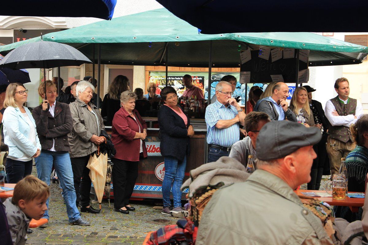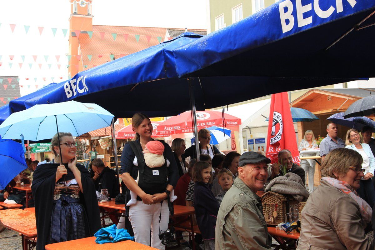 „Wir feiern Bayern“, hat die Bayerische Staatsregierung zum Doppeljubiläum von 100 Jahren Freistaat und 200 Jahren Verfassungsstaat Bayern ausgerufen. Das brauchte man uns in Mainburg nicht zweimal zu sagen. Das Jubiläum war ein willkommener Anlass für das Leitmotiv des diesjährigen Altstadtfestes. Man könnte sagen, die Stadt hat „brutal Glück gehabt“ am Wochenende. Nachdem schon der Samstag verregnet war, blieb die Hopfenstadt auch am Sonntag nicht von Regenschauern verschont. Die Verantwortlichen rechneten sogar schon mit einer Absage des Festes. Es war eine regelrechte Zitterpartie, doch am Ende sollte Petrus doch noch ein Einsehen haben. Die Sonntagsmesse am zweiten Tag des Mainburger Altstadtfestes musste noch in der Stadtpfarrkirche abgehalten, und der anschließende Bieranstich fiel im wahrsten Wortsinn „feuchtfröhlich“ aus. Nachdem die Schlechtwetterfront am Sonntag bis 14 Uhr anhielt, war das Zentrum anfangs so gut wie leer. Nur ein paar ganz Hartgesottene zeigten sich. Sobald es jedoch trocken wurde, strömten die Besucher wieder in die Altstadt und bewiesen dieses besondere Gemeinschaftsgefühl, das man als ureigene bayerische Tugend bezeichnen kann.