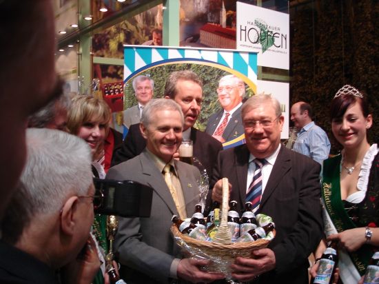 Vorsitzender Josef Wittmann, Präsident Dr. Johann Pichlmaier, Geschäftsführer Otmar Weingarten und die Hallertauer Hopfenhoheiten überreichten Staatsminister Josef Miller nach dem Ministerbieranstich einen Geschenkkorb mit einigen handetikettierten und handabgefüllten Flaschen des "Ministerbiers" mit den besten Grüßen der Hallertauer Hopfenpflanzer.