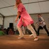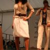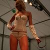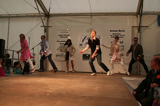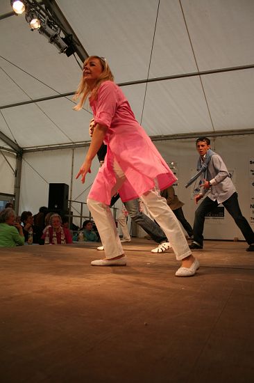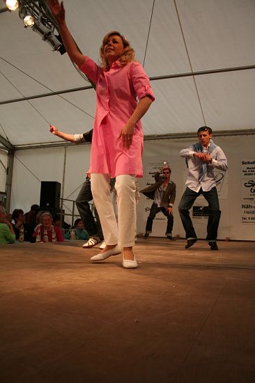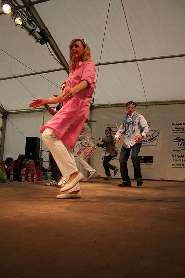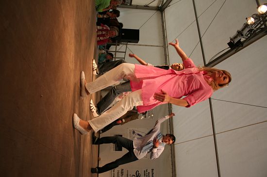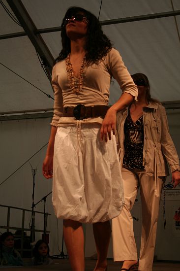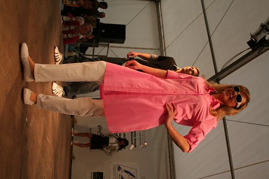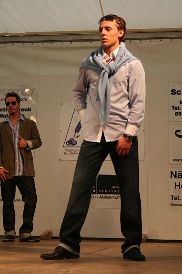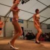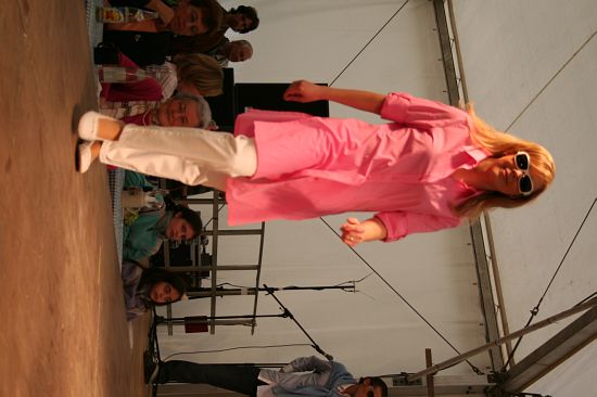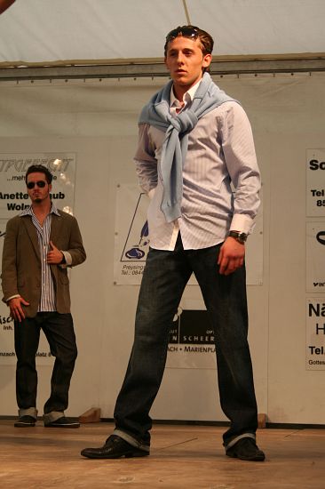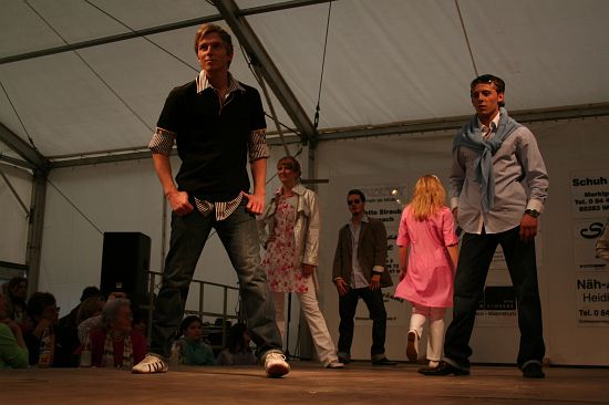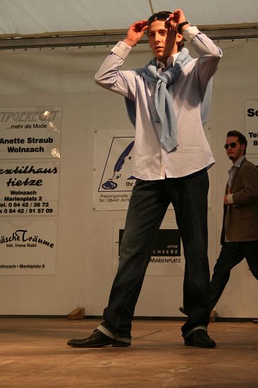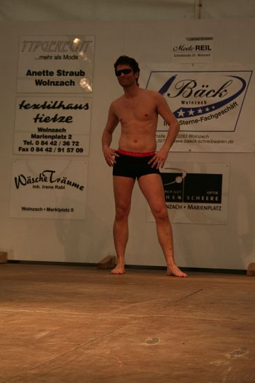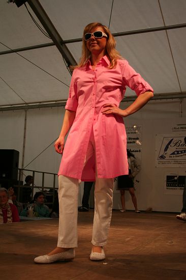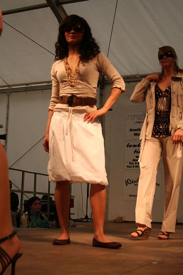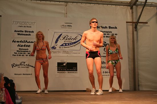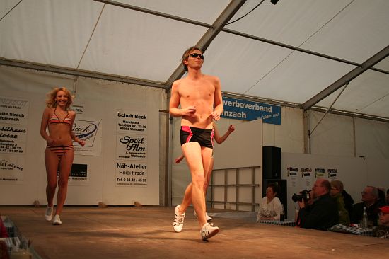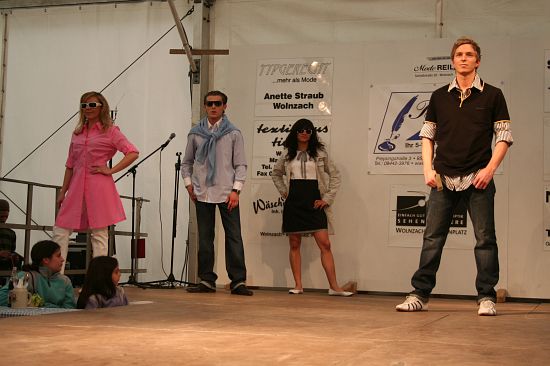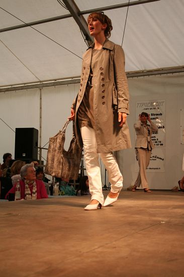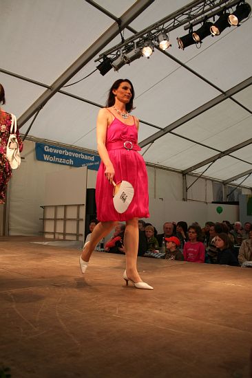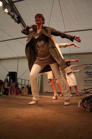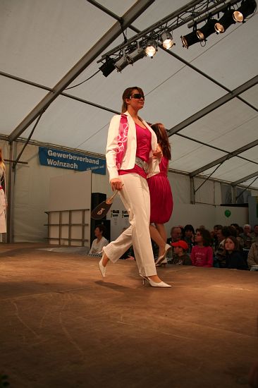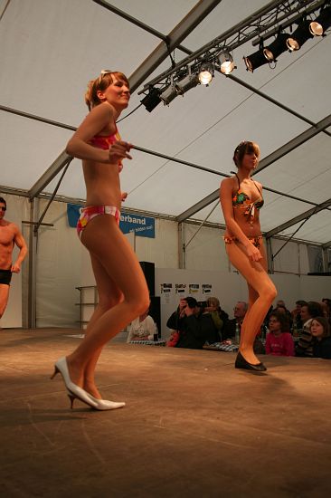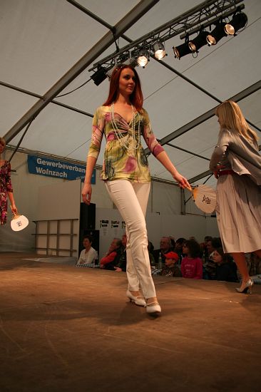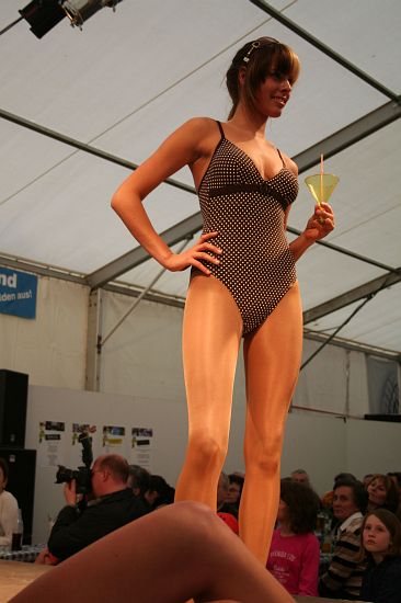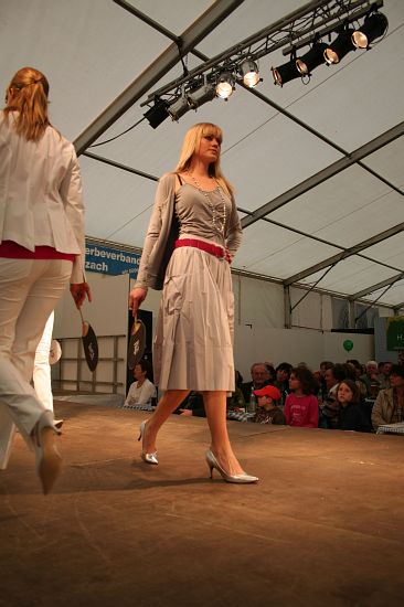 Die Modenschau veranstalteten die Firmen Trendline, Wäscheträume, Sportalm ... wie schon in den Vormessen auf dem extra errichteten Laufsteg im Gastronomiebereich. Mit einer starken Soundtechnik und poppiger Musik lockte dieser Bereich die Besucher an. Ab 14 Uhr waren alle Plätze belegt. Viele Zuschauer standen in den Zwischenreihen. Tanzvorführungen von Kindern heizten die Stimmung an. Um 16 Uhr ging es dann mit den Profi-Models richtig zur Sache. Sie waren zuvor schon aufgefallen, als sie sich mit ihrem fahrbaren Begleitgepäck umsahen: faszinierend hübsche Damen. Doch in einer Modenschau dominieren die Kleider und Dessous. Da werden die Köpfe zur Zugabe.