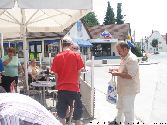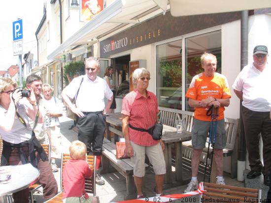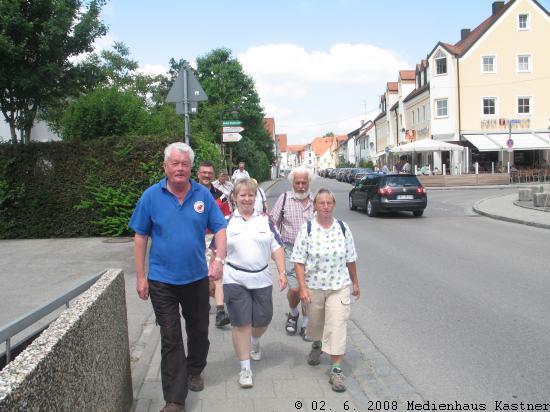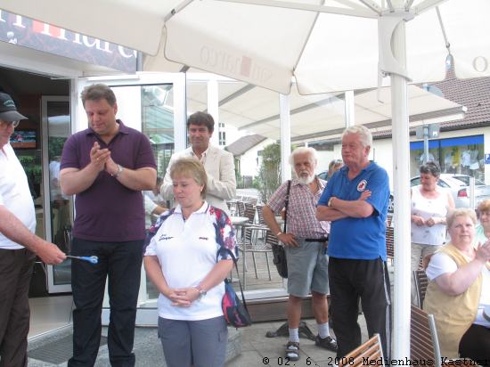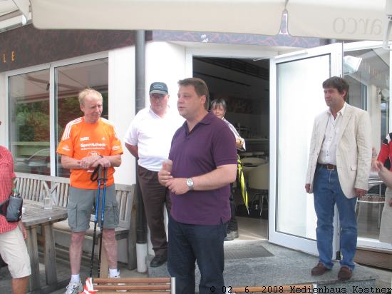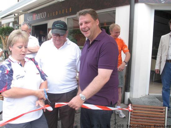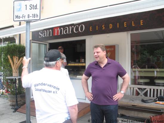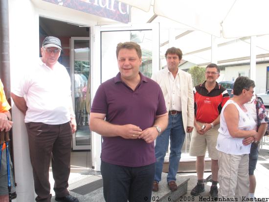 Zur Eröffnung des "Permanenten IVV-Wanderweges" waren über 20 Leute gekommen, ein gutgelaunter Jens Machold hielt eine kurze Rede und durchschnitt dann zusammen mit den Verantwortlichen vom Wanderverein Gosseltshausen symbolisch ein Band. 22 Grad, ein paar Wölkchen - also ideales Wanderwetter. Rund ein Dutzend fröhliche Wanderer starteten dann gleich zum neuen Rundweg. Jens Machold entschuldigte sich, dass er nicht mitwandern konnte, und empfahl den Wanderern, zur Entspannung im Anschluss, den Besuch des neuen Schwimmbades.