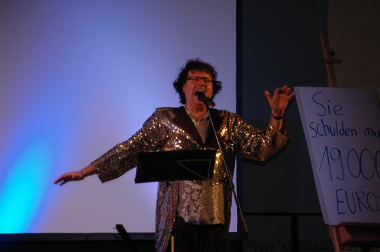 Seinen nächsten Auftritt stellte Brüske unter das Zeichen der Globalisierung. "In China gibt es blühende Landschaften. Und das obwohl die Mauer noch steht" und heizte damit die Stimmung nochmals in Richtung Höhepunkt an. Da dänische Krabbenfischer ihrem Fang zum günstigeren Puhlen nach Taiwan schicken, hätte so mancher Krabbensalat mehr Reisekilometer hinter sich als Hans-Dietrich Genscher. Auch musikalisch war Brüske ein echter Profi. So gab der ausgebildete Kammersänger einen Grönemeyer-Hit in etwas anderer Form zum Besten: "Wir werden um Grund und Bogen gebracht - Inder an die Macht!".