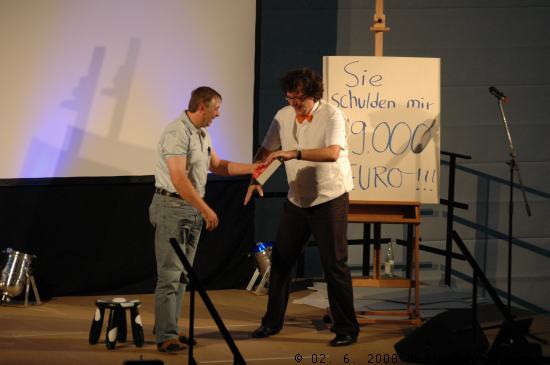 Richtig schlau waren die Steuerberechnungen von Kabarettist Brüske. Er berechnete beispielhaft an seinem Bühnengast "Elektriker Peter", dass er bei einem angenommenen Jahresbruttoeinkommen von 100.000 Euro, nach Abzug aller Steuern, immerhin noch mit dem verbleibenden Rest von rund 25.000 Euro gut leben könne. "Ziehen wir jetzt noch die neue Abgeltungssteuer von 25% ab, dann ist Ihr Geld futsch!" so Brüske. "Wenn wir jetzt die 19% Mehrwertsteuer nicht vergessen, dann schulden Sie mir 19.000 Euro" rechnete Brüske dem etwas verdutzten Bühnengast vor. Ein Geschenk "im Wert von mehreren tausend Euro" überreichte Brüske das Buch "1.000 legale Steuertricks", welches ein Bestseller sei und 80 Mal häufiger verkauft wurde als das Kamasutra.