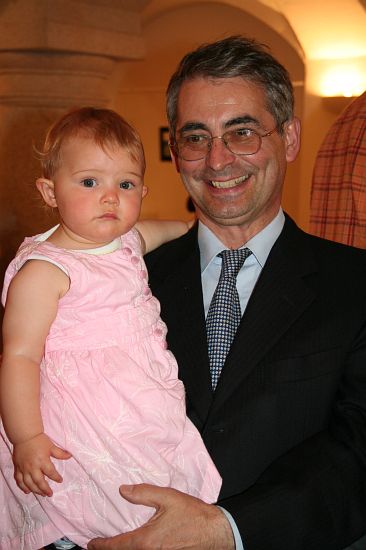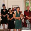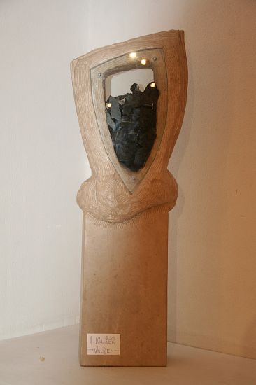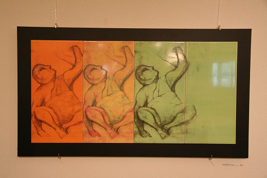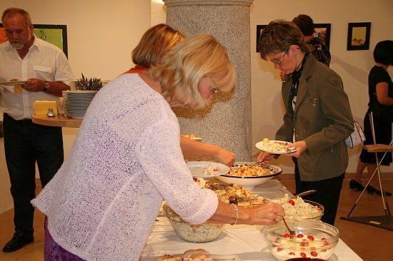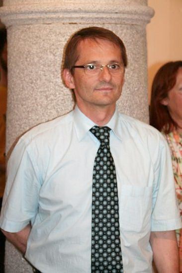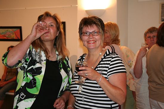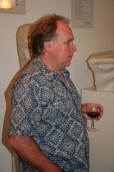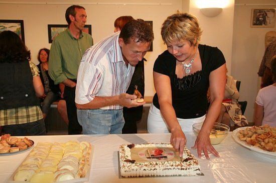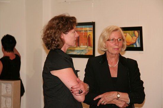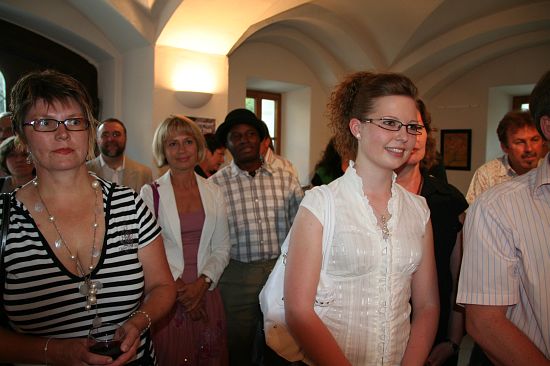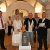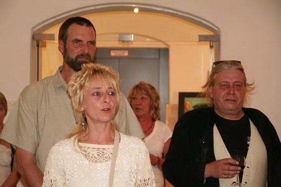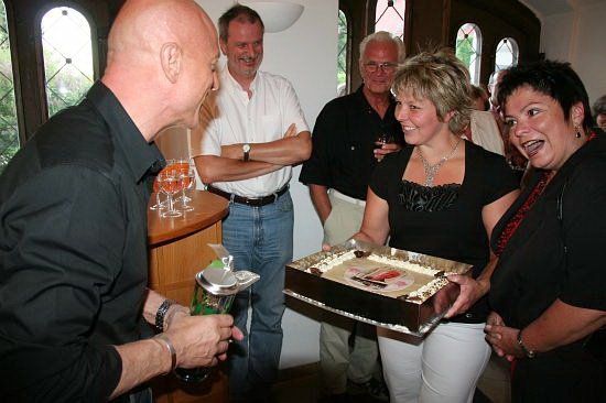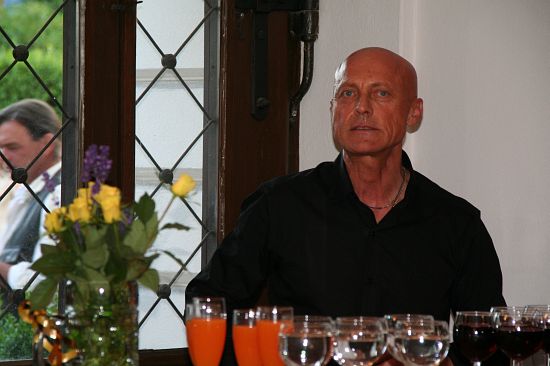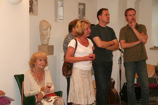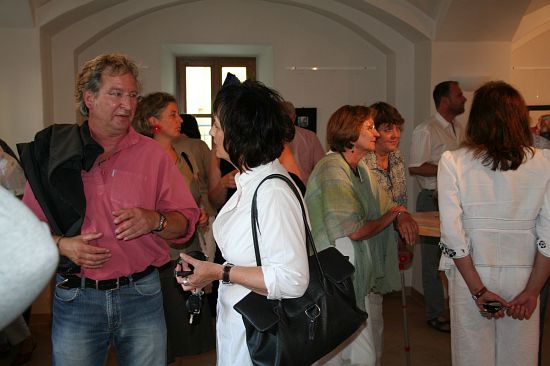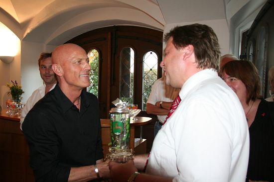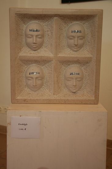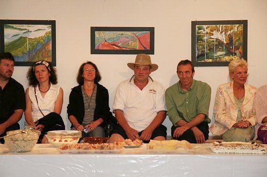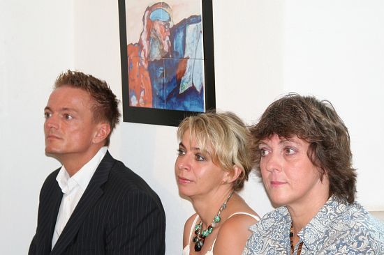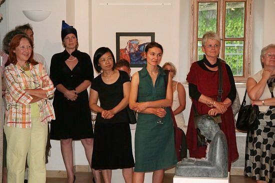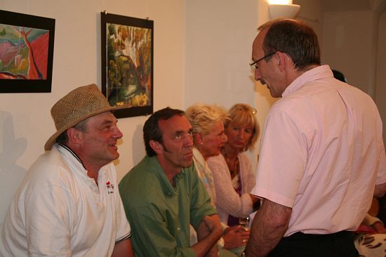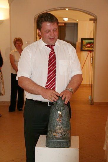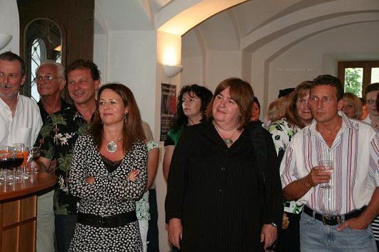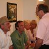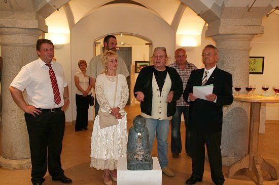Wolnzach, 27.06.08 (ted). Auf diese Ausstellung der Galerie P. ist selbst Bürgermeister Jens Machold stolz: Bei der Vernissage am Freitagabend übernahm er die Begrüßung der vielen Gäste. Kulturreferent Alois Siegmund stellte die 3 Künstler vor: Michael Königer aus Mühlhausen / Rocksdorf (Bildhauer & Steinmetz z. B. des Geldspuckers, Helmut Raum aus Painten (Köpfe-Skulpturen) und Enno Messerschmitt aus Attenkirchen / Wimpasing, der auf Fliesen malt und sie dann bei 800° einbrennt. Er ist von Beruf Grafiker & Siebdrucker. Ein 2-Meter-Mann. Gastgeberin Nathalie Ponsot dankte allen, gratulierte ihrem Lebensgefährten Siegfried Vogl-Wolf zum 57. Geburtstag – er half wie immer als Mann hinter der Theke.