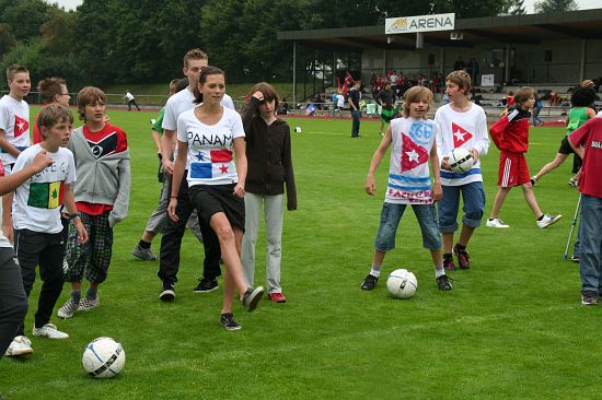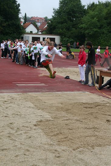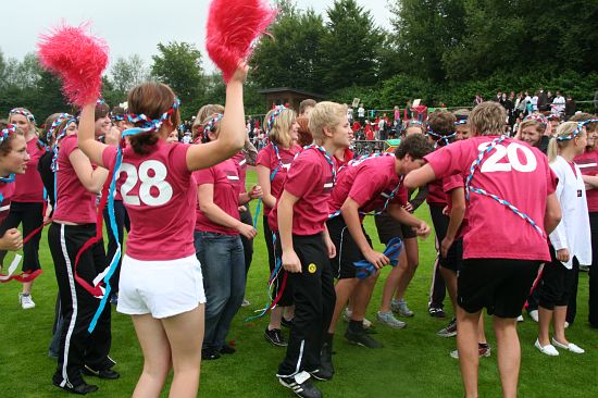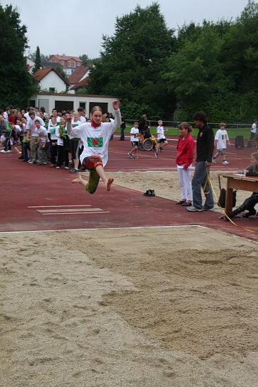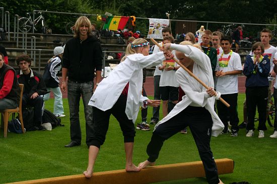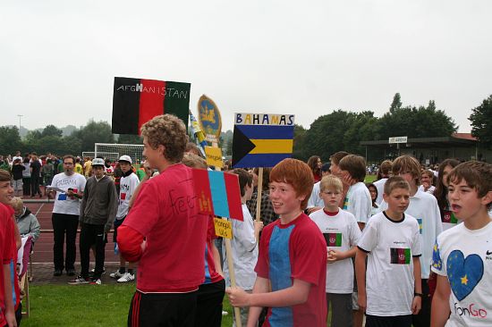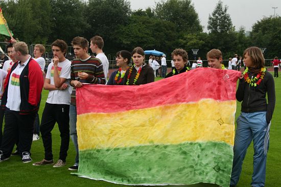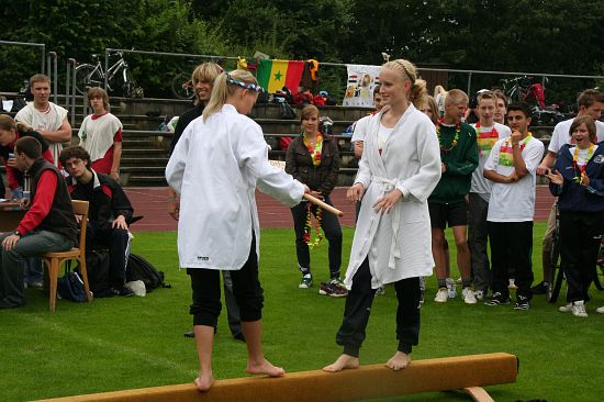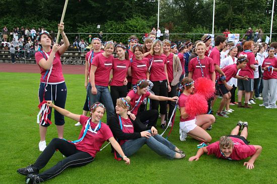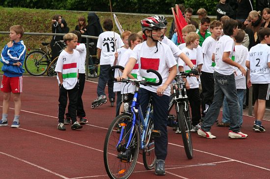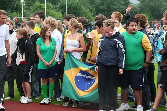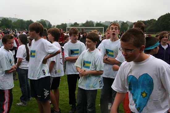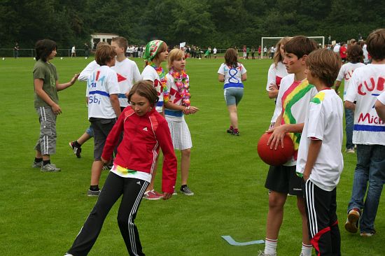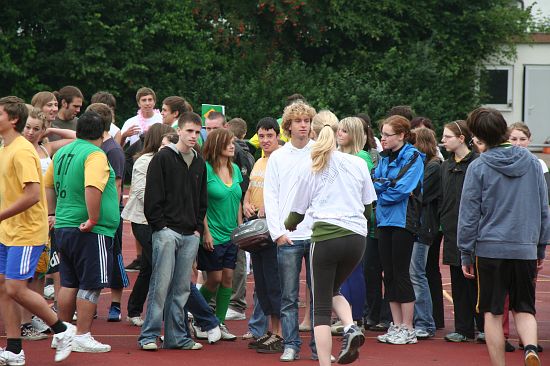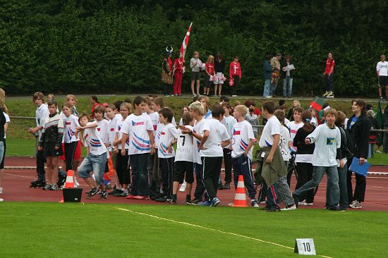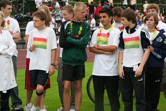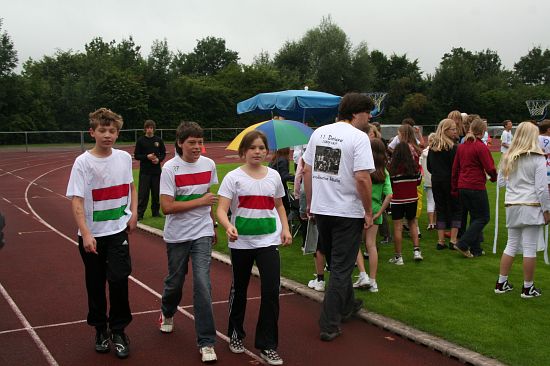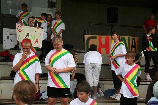 Wolnzach (23.7.2008; hpb). Bei idealem Sportlerwetter fanden am Mittwoch die „Olympischen Sommerspiele“ statt. Die Schulklassen repräsentierten Sportmannschaften aus verschiedenen Ländern der Welt, die an „internationalen“ Wettkämpfen in der ARS-Arena teilnahmen. Alle waren in bester Stimmung und genossen die willkommene Abwechslung vom schulischen Alltag. Den Zuschauern bot sich beim Einzug der Sportler ein farbenfroher und prächtiger Anblick mit internationalem Flair, bevor die einzelnen Teams zum Wettstreit gegeneinander antraten.