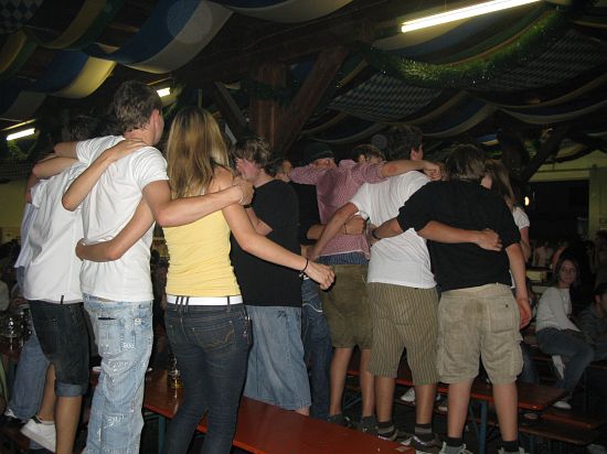 Au, 26.7.08 (ted). Auch wenn die Auer um die Wirtentscheidung und „seine“ Bands hadern, für den Besucher aus der Hallertau bietet das Hopfenfest die ideale Atmosphäre, mitzutanzen (auf den Bänken), mitzusingen, sich wohl zu fühlen. Das kommt aus der Geborgenheit des Ex-Hopfenabwaage-Raums. Und die Auer präsentieren jeden Abend eine „heiße“ Band wie Inflagranti, Move oder ähnliche Show-Spezialisten. Da ist Top-Stimmung inklusive. Und wenn „Highway to hell“ anklingt, ist der Bär los..