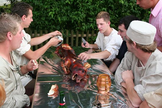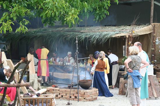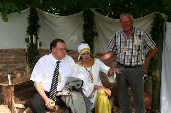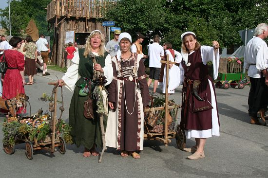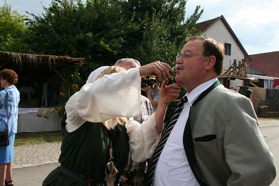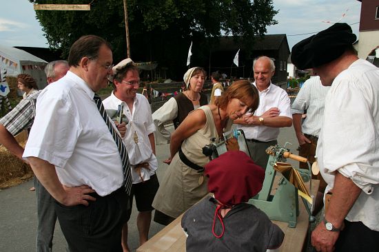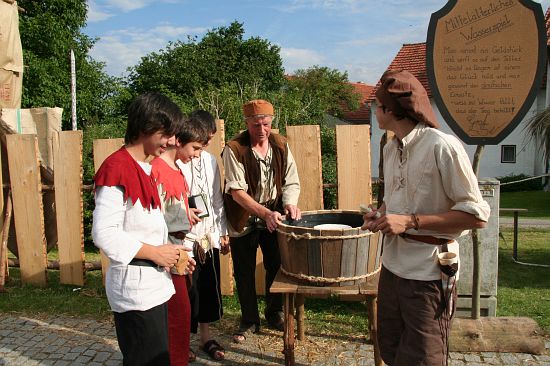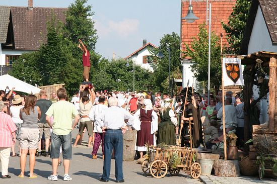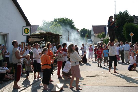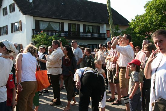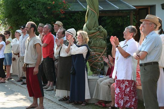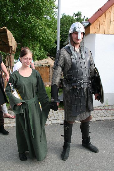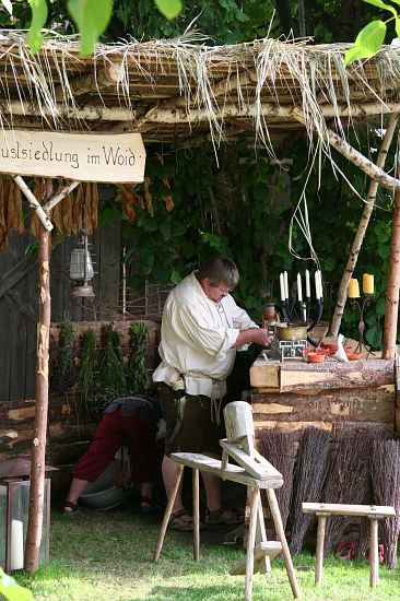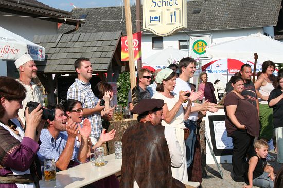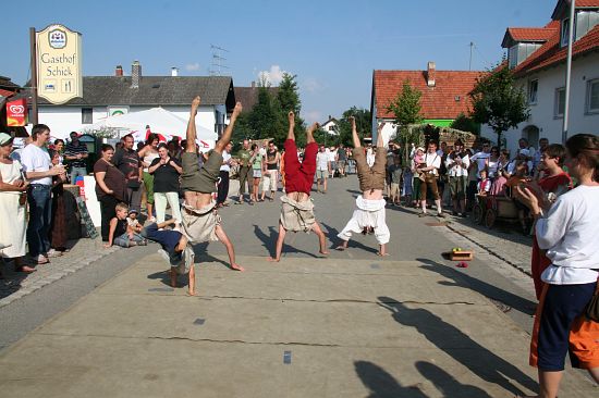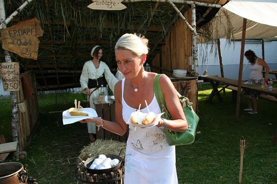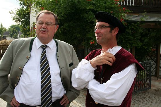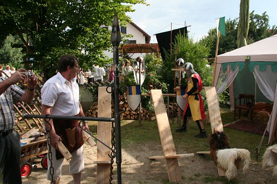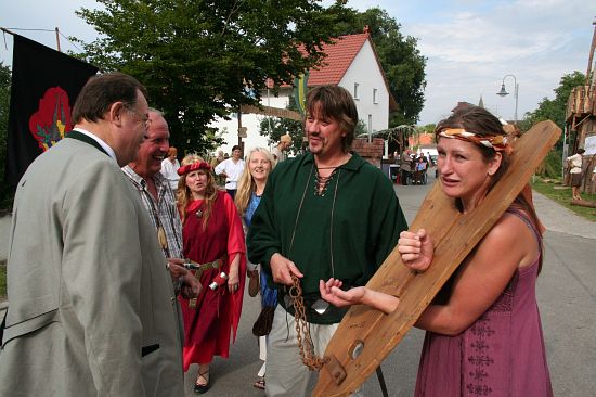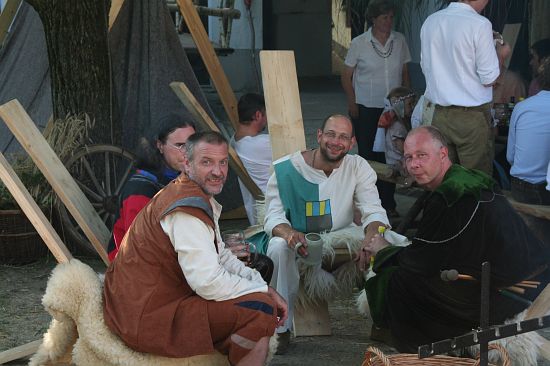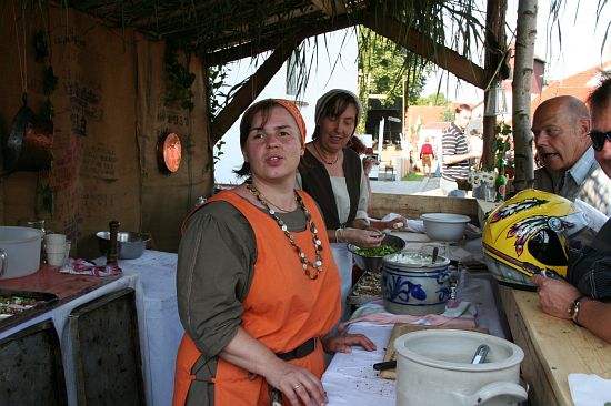Sünzhausen (26./27.7.2008; hpb). In Begleitung des Landrats Josef Schäch, 2. Bürgermeisterin Gabi Kaindl und des Haupt-Organisators Johannes Zellner besuchte unser rasender Reporter am Samstagabend die mittelalterliche Dorfgemeinschaft Sindeohuisir. Nach der Besichtigung der einzelnen Stände, die liebevoll aus Holz gezimmert worden waren, hätten die Eindrücke nicht vielseitiger sein können: Spanferkel und Hähnchen wurden an verschiedenen Feuerstellen gegrillt und gebraten. Überhaupt war für das leibliche Wohl hervorragend gesorgt, es gab Mittagstisch, Brotzeiten und viele andere Speisen sowie Getränke von Fa. Trumann. Das Lagerleben brodelte, es herrschte beste Stimmung und den Besuchern wurde viel geboten. Sie fühlten sich um Jahrhunderte zurückversetzt, so stilecht waren Kostüme und Requisiten. Ein großes Lob an die Sünzhausener, die ihre 1200-Jahr-Feier so großartig auf die Beine gestellt haben.