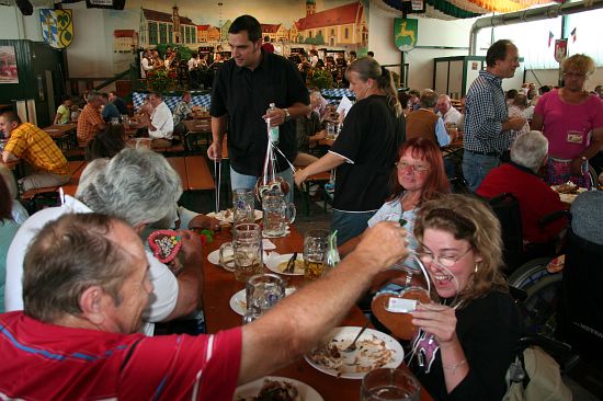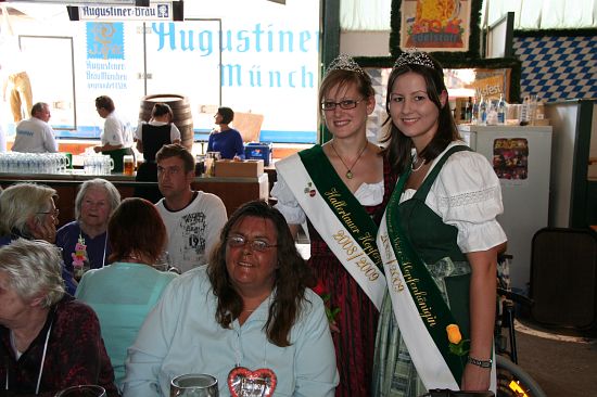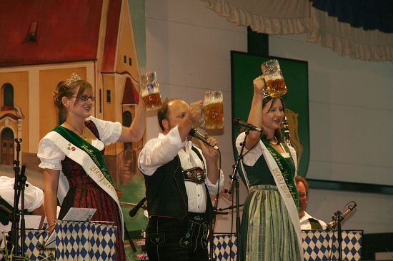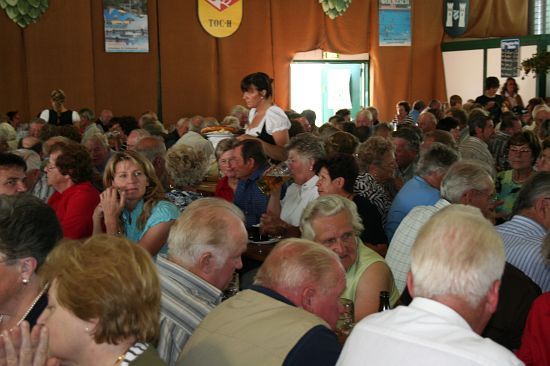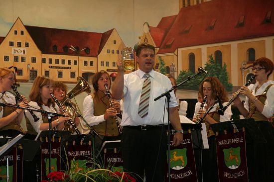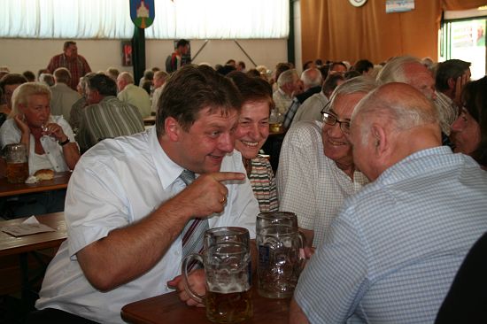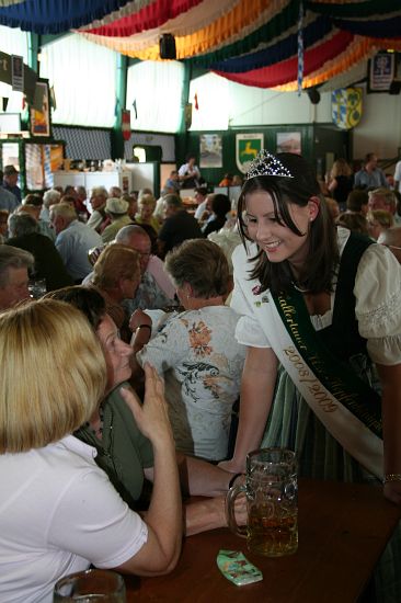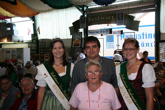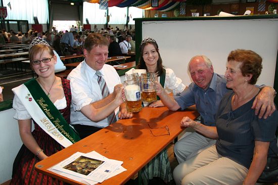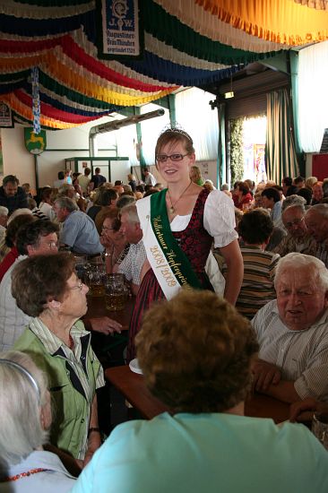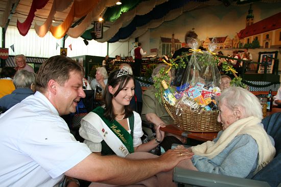 Wolnzach (13.8.2008; hpb). Auch in diesem Jahr wurde der traditionelle Seniorennachmittag auf dem Hallertauer Volksfest bestens angenommen. Es gab nicht nur das „kleine Jubiläum“ des Volksfestes zu feiern, sondern auch einige Geburtstage. Besondere Glückwünsche übermittelte 1. Bürgermeister Jens Machold Johanna Nass aus dem BRK-Seniorenheim anlässlich ihres 100. Geburtstages. Weitere Geburtstagskinder des Tages waren Barbara Kellerer aus Wolnzach (89 Jahre), Magdalena Summerer, Beigelswinden (87 Jahre), Rudolf Kattner, Auhöfe (71 Jahre), Eduard Niederlechner, Geroldshausen (69 Jahre) und Rosa Kattner, Auhöfe (68 Jahre). Auch die neu gewählte Hopfenvizekönigin Maria Hainzinger und Hopfenprinzessin Franziska Sternecker gratulierten den Ehrengästen. Bürgermeister Jens Machold ließ sich von den Festbesuchern erzählen, wie das Hallertauer Volksfest vor 60 Jahren gefeiert wurde. Dabei wurden so manche Erinnerungen wach und alte Geschichten lebten wieder auf. Beim gemütlichen Beisammensein klang der gelungene Seniorennachmittag aus, den die Marktkapelle Wolnzach musikalisch umrahmte.