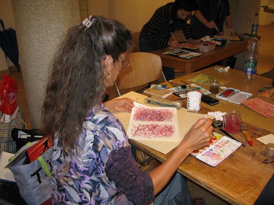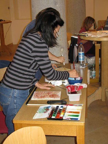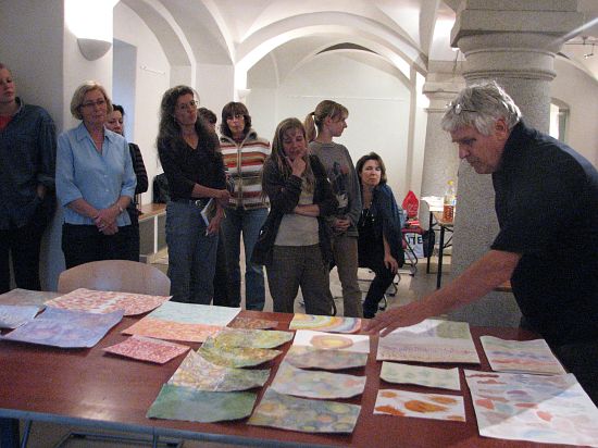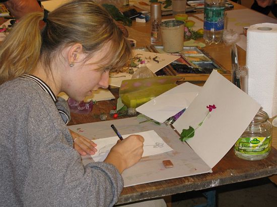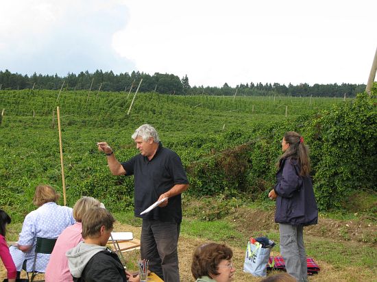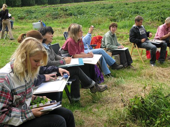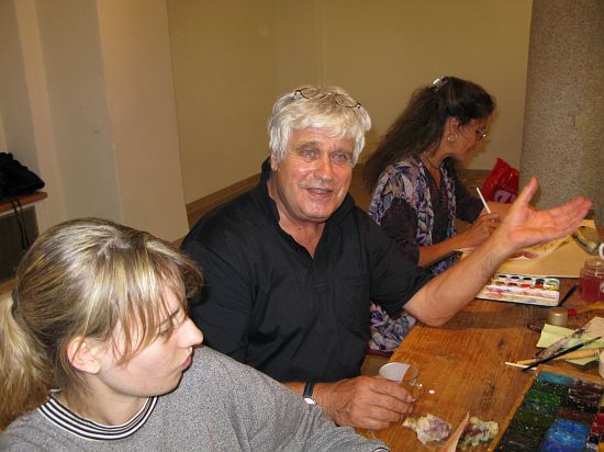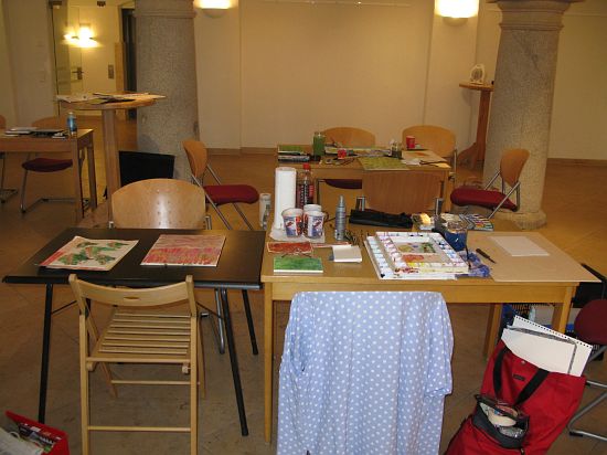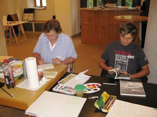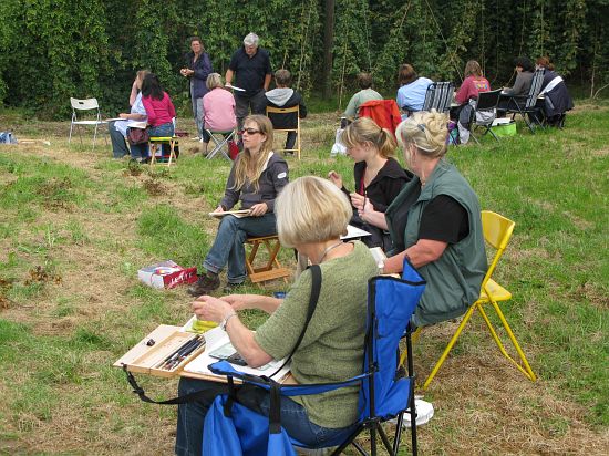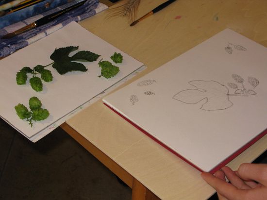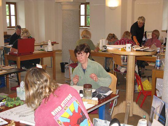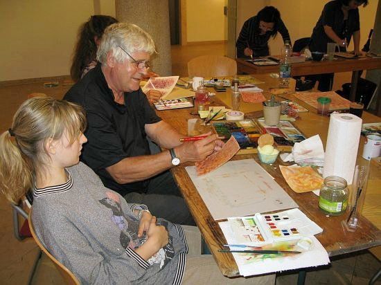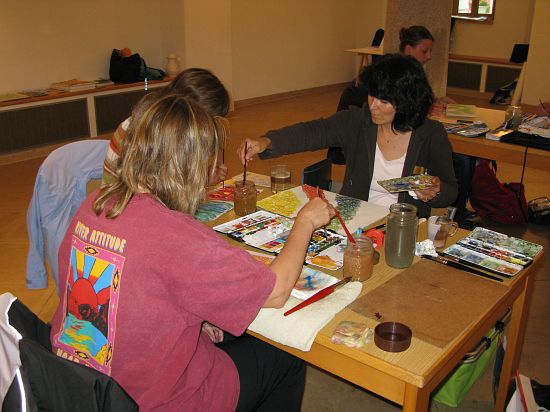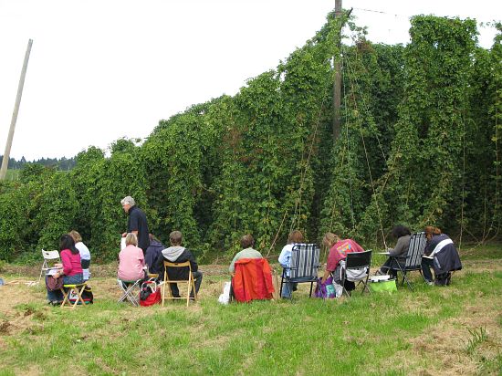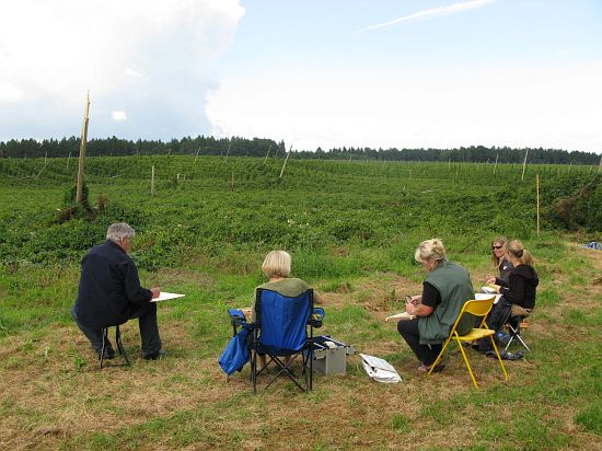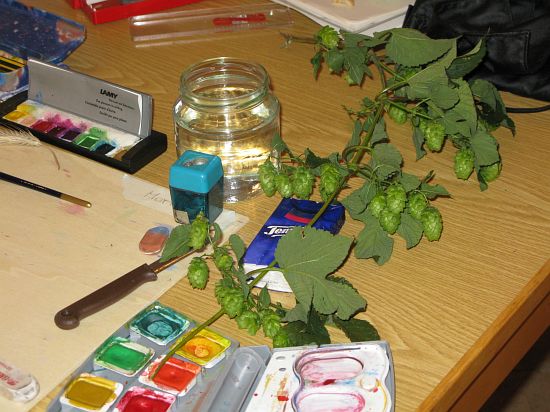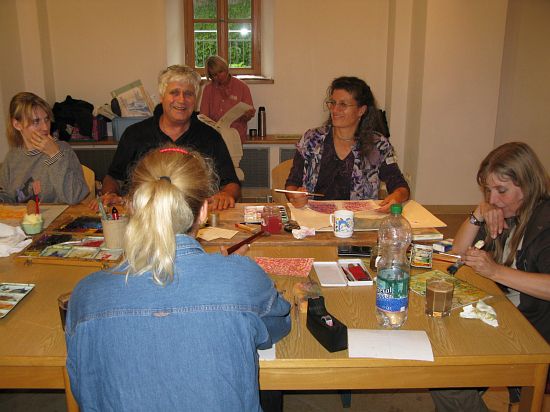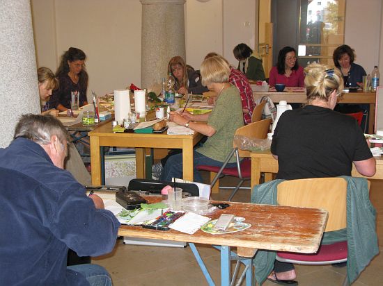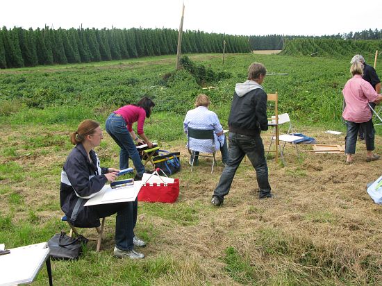 Wolnzach, 15.8.08 (ted). Pünktlich um 9 Uhr fanden sich die rund 20 Studierenden mit Prof. Fridhelm Klein im Rathauskeller ein. Da es regnete, musste die Exkursion in einen Hopfengarten auf den nächsten Tag verschoben werden. Tische und Stühle wurden aus dem Sitzungssaal organisiert und um 10 Uhr konnte der Malbetrieb voll umfänglich beginnen, wurden Techniken erklärt, Motive besprochen und dann ganz konkret Gemälde geschaffen. Am Samstagabend werden ab 19.30 Uhr alle Werke vorgestellt und der Öffentlichkeit wie eine Vernissage präsentiert.